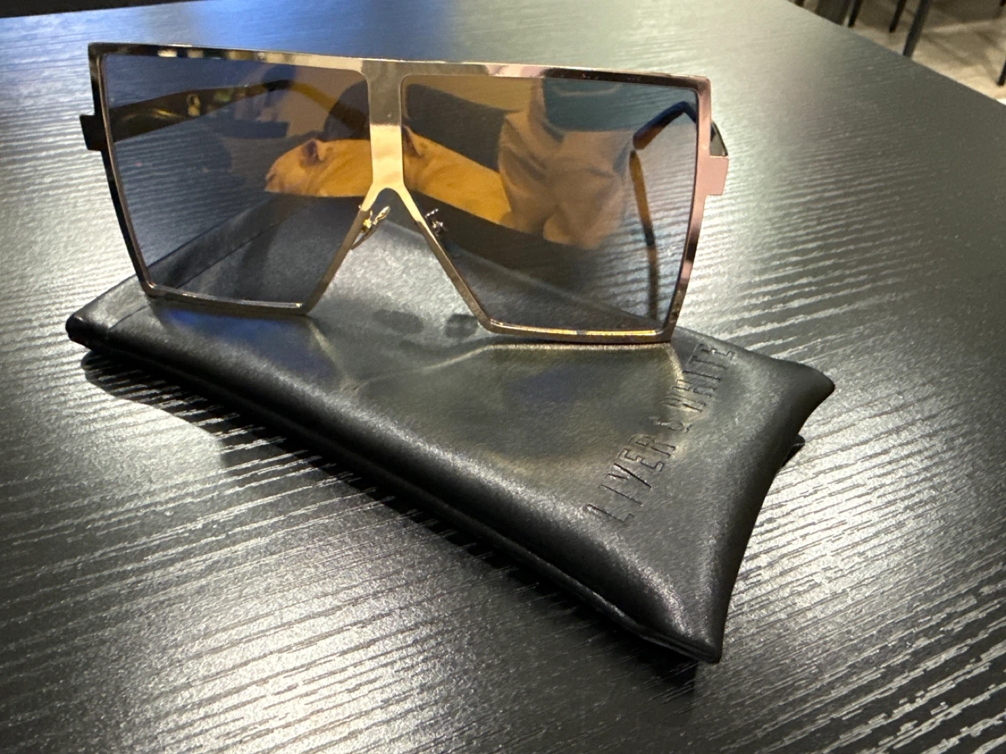 Selling a pair of Liver & White sunglasses in gold! These sunglasses have a unique, stylish look and come with a case to keep them protected. They're in great condition and ready for a new owner