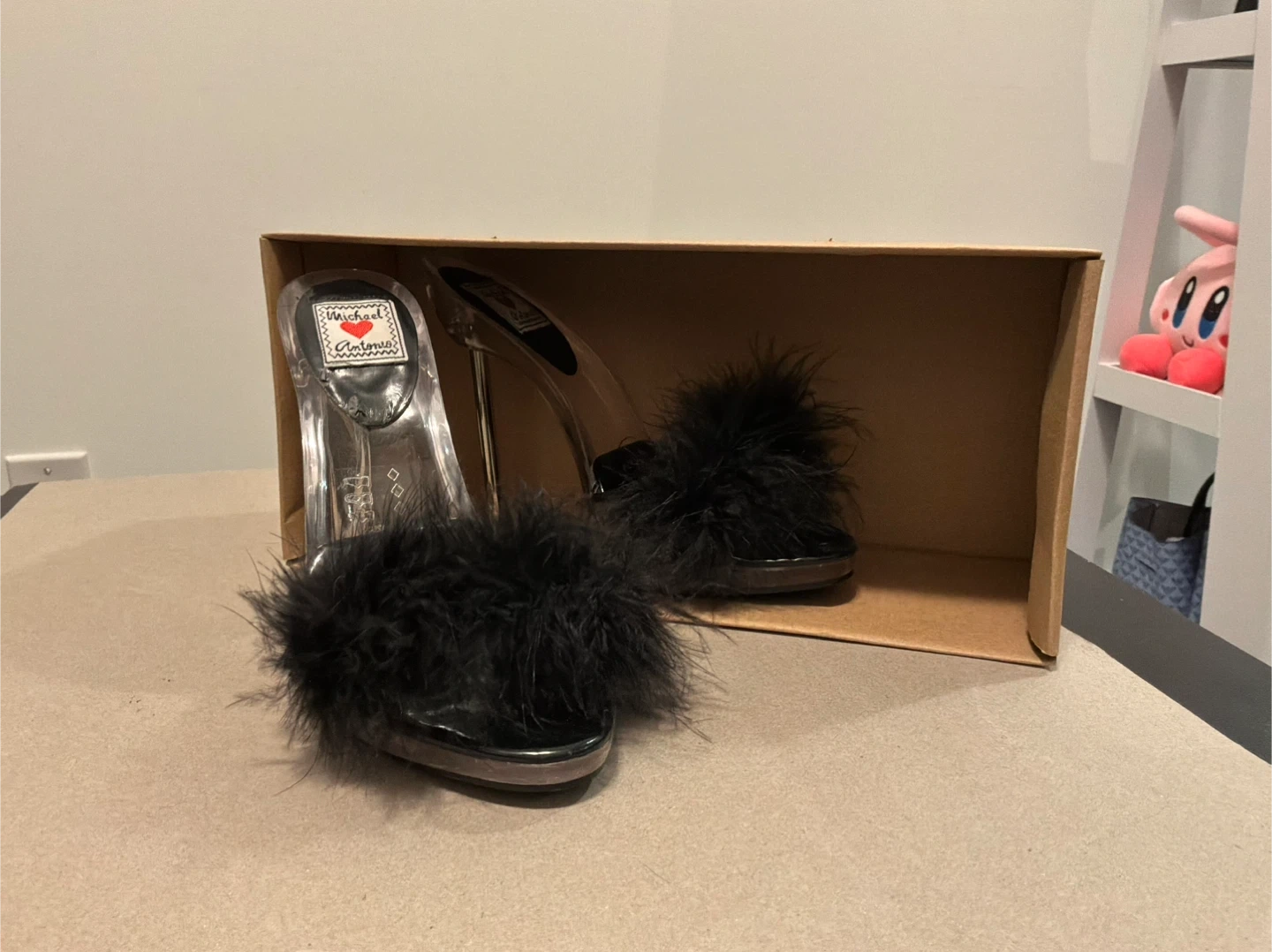 These black heels feature fluffy feather detailing on the front strap. They have a clear perspex heel for a stylish look. A classic sandal design. Size 6-7