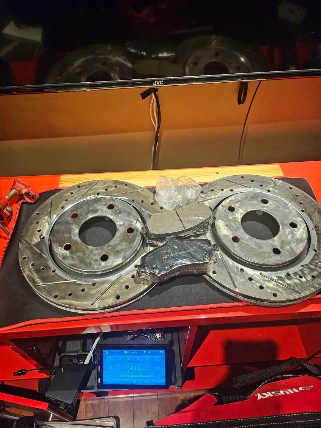 Set of drilled and slotted brake rotors and brake pads. These parts are designed for improved stopping power and heat dissipation. Direct replacement for many vehicles with 5x127. Originally was going.to be used for a 2010 caravan.