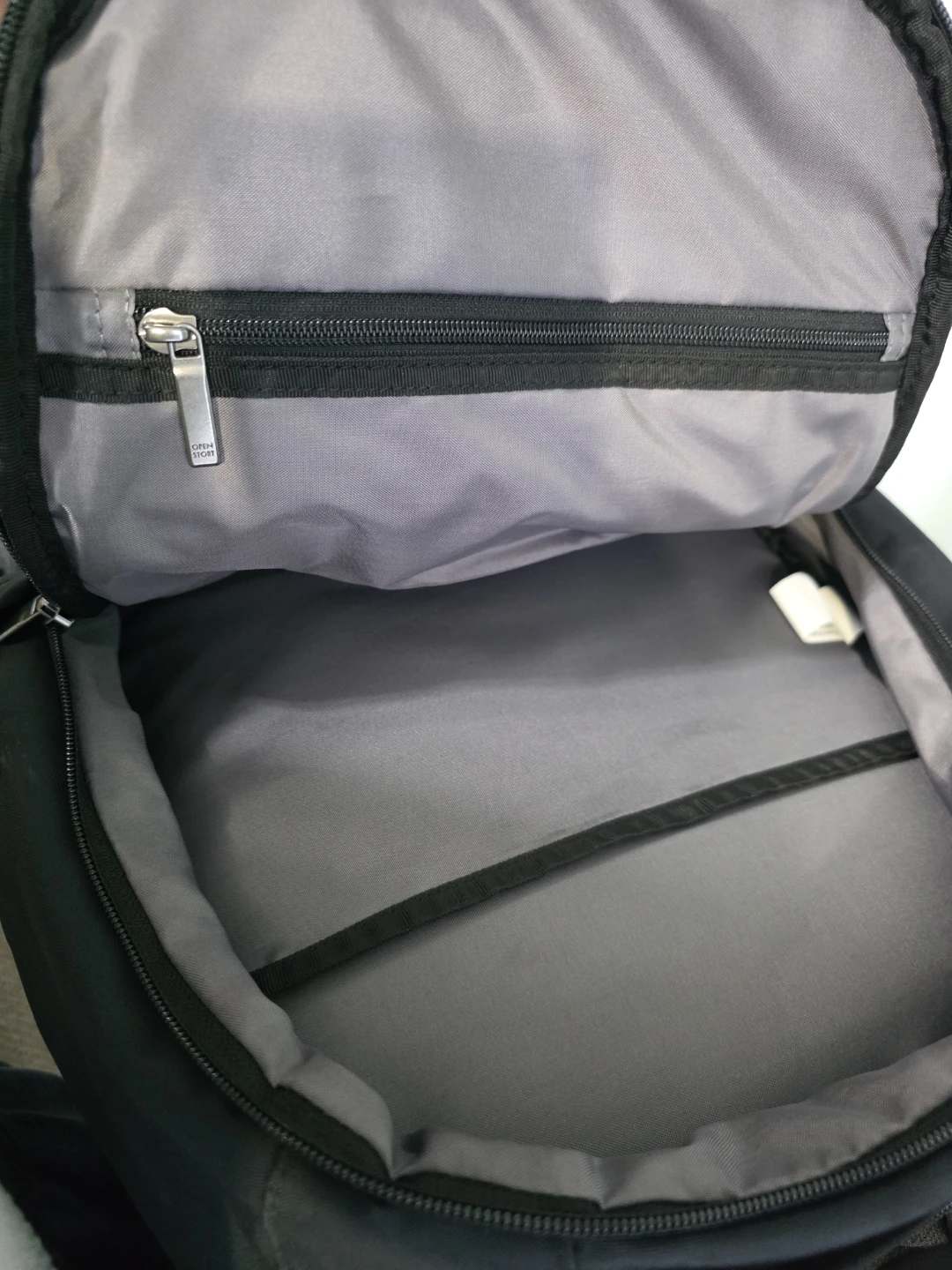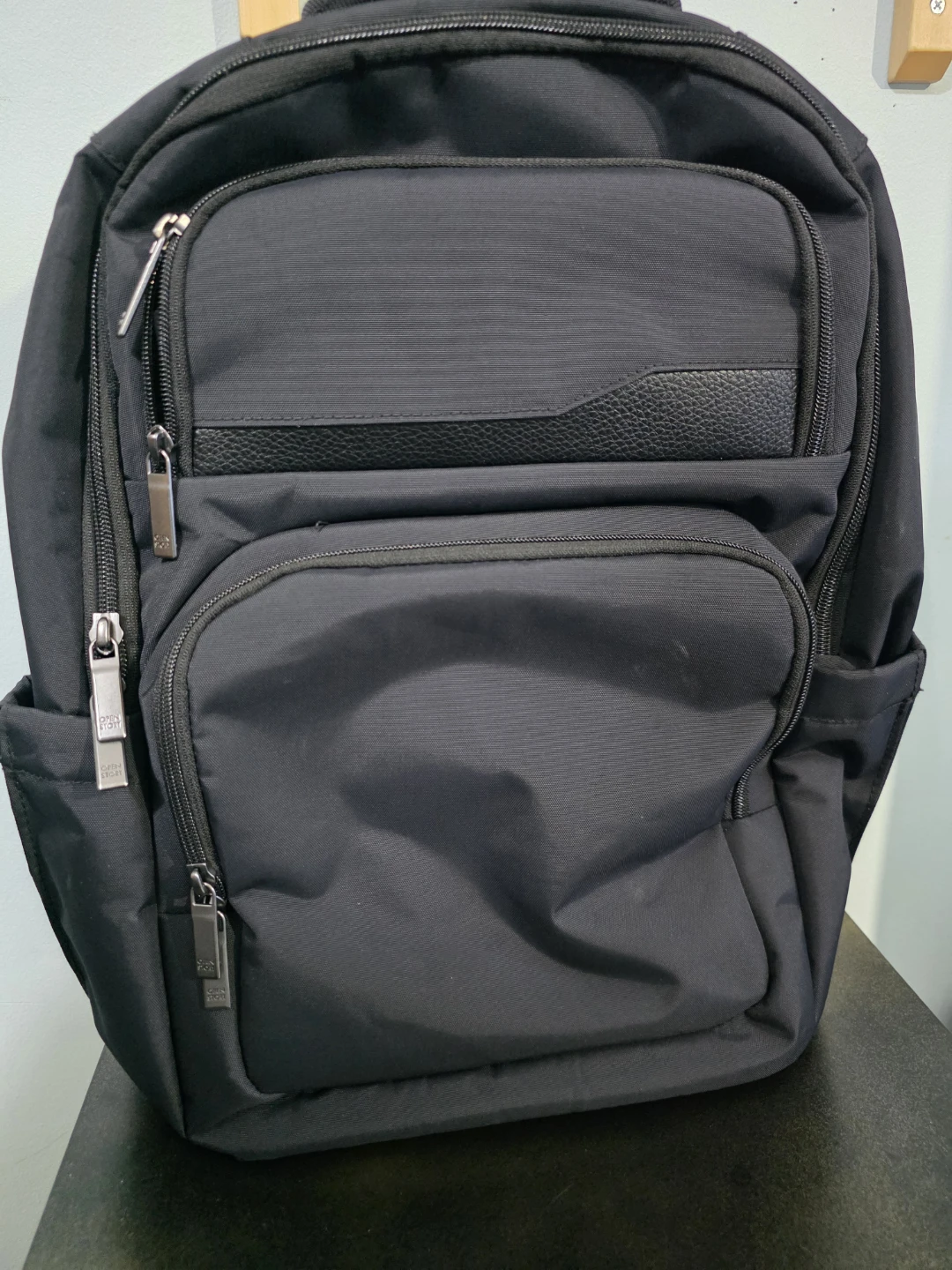 This is a black backpack with multiple compartments. It's made of durable fabric. This backpack is great for everyday use or travel!
