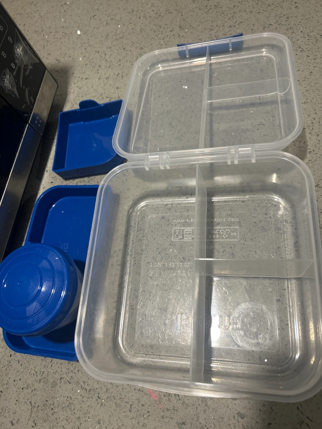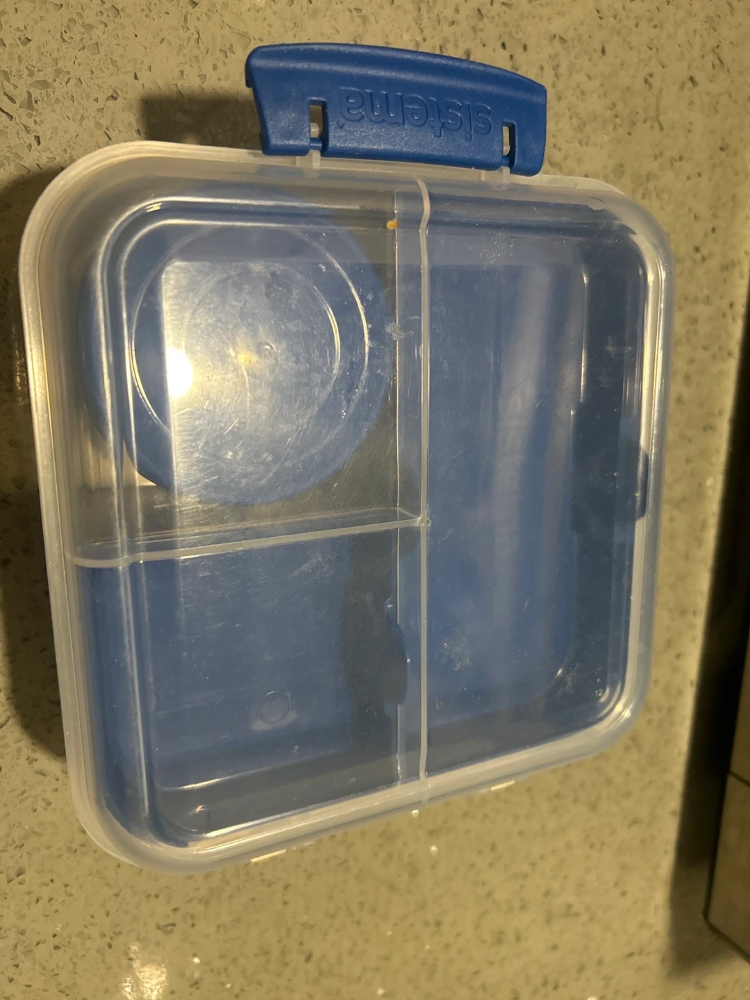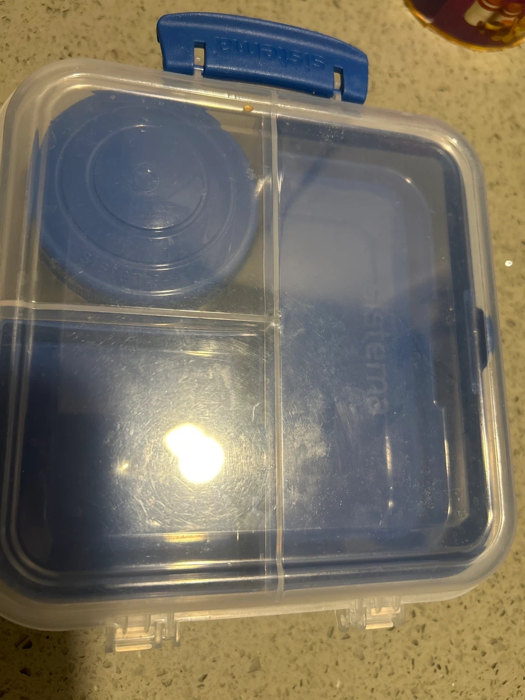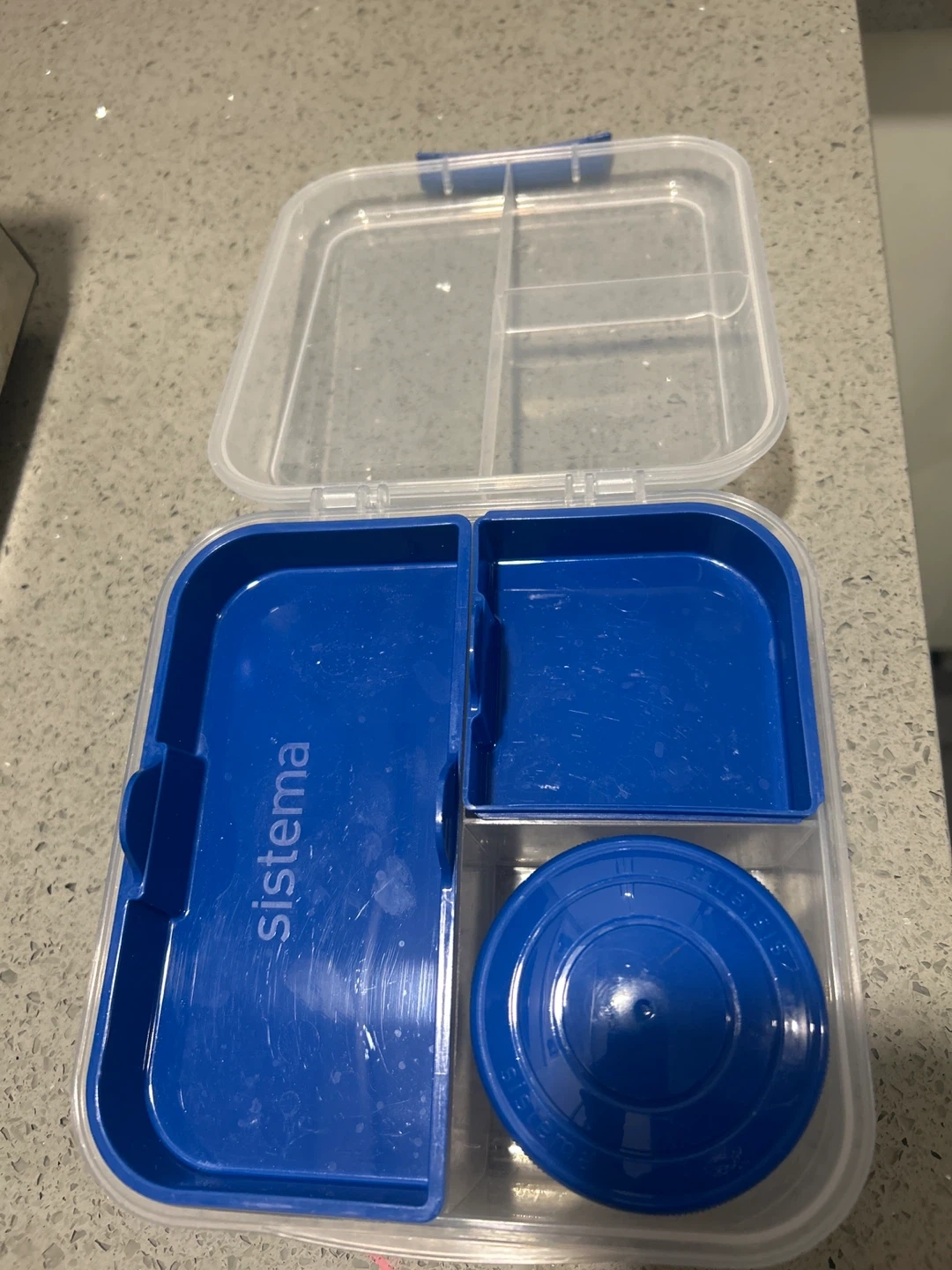 Sistema blue bento box with multiple compartments and a screw-top round container. BPA-free plastic construction. Perfect for packing lunches for school or work!