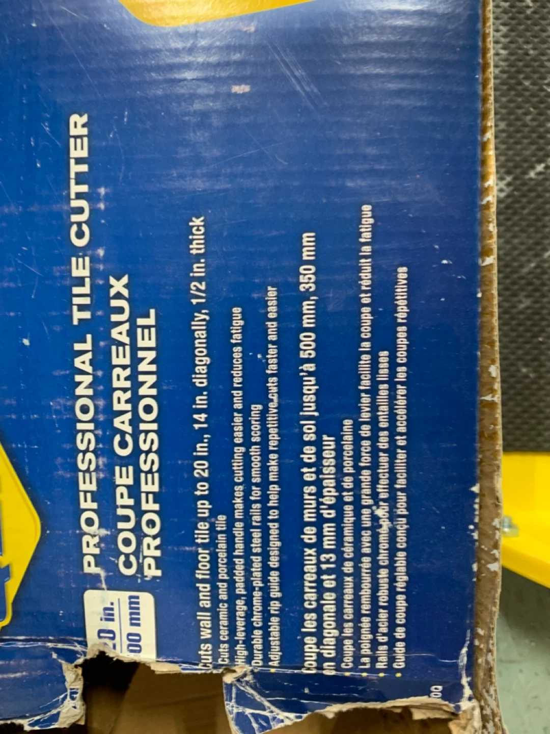 This is a professional tile cutter. It cuts wall and floor tile up to 20 in. diagonally, 1/2 in. thick. Cuts ceramic and porcelain tile. Adjustable rip guide designed to help make repetitive cuts faster and easier.
