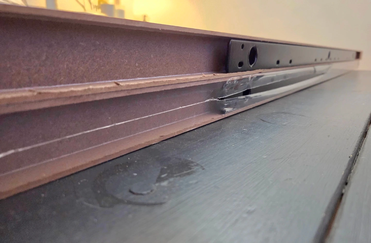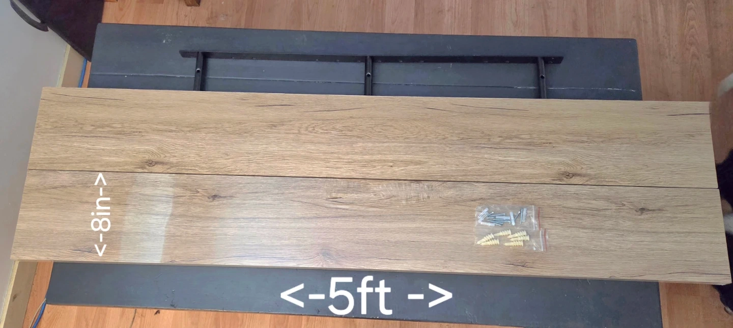 Wooden floating shelf with a natural oak finish. Includes mounting hardware for easy installation. Approximate dimensions are 5 feet long and 8 inches deep. It's great for displaying decor or storage!
