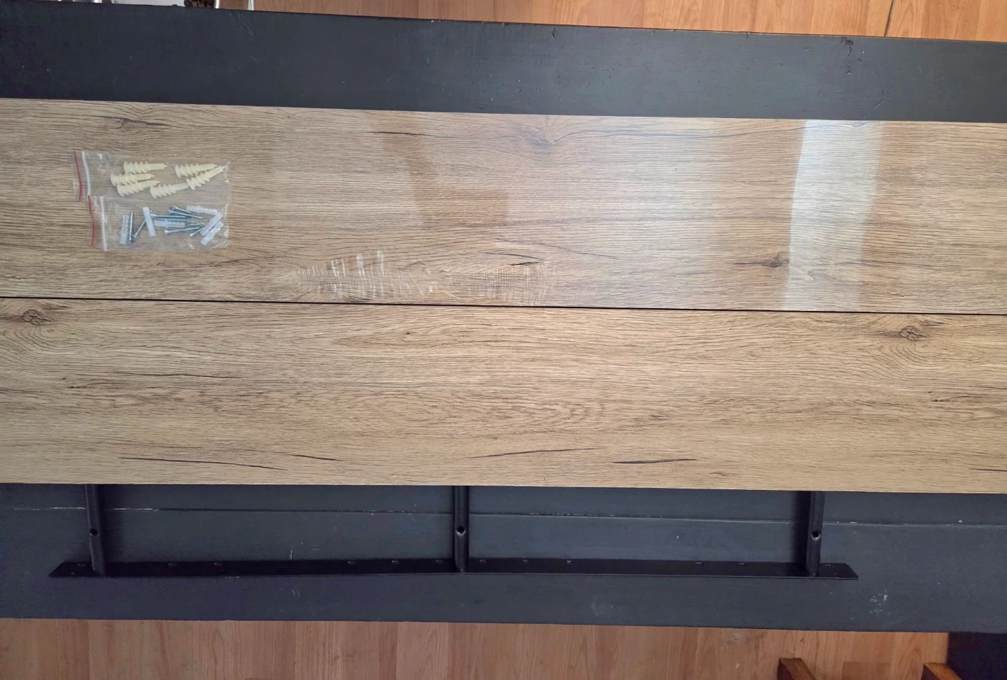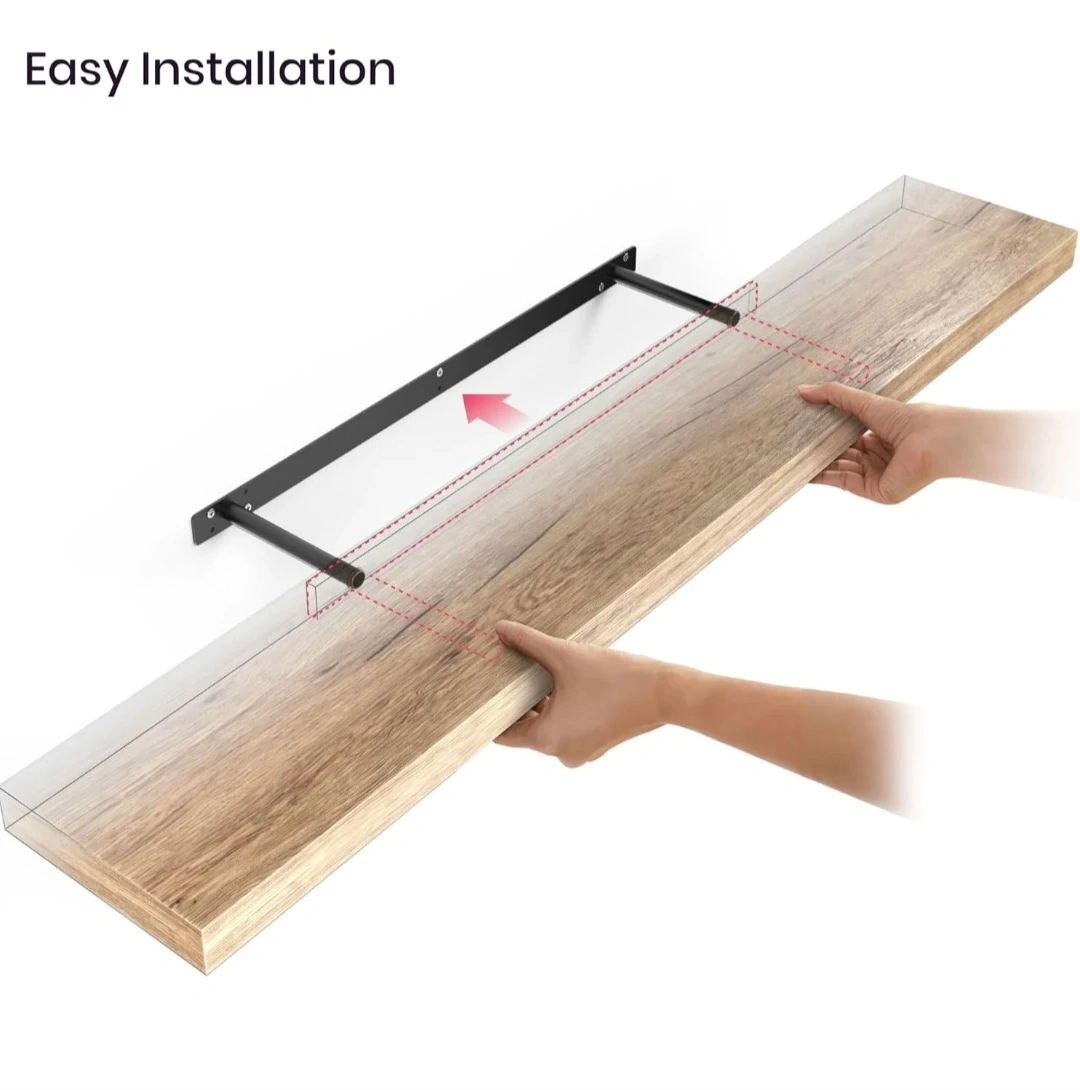 Wooden floating shelf with a natural oak finish. Includes mounting hardware for easy installation. Approximate dimensions are 5 feet long and 8 inches deep. It's great for displaying decor or storage!
