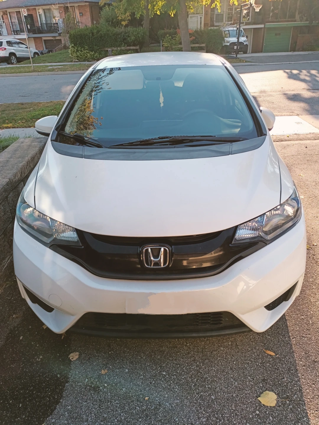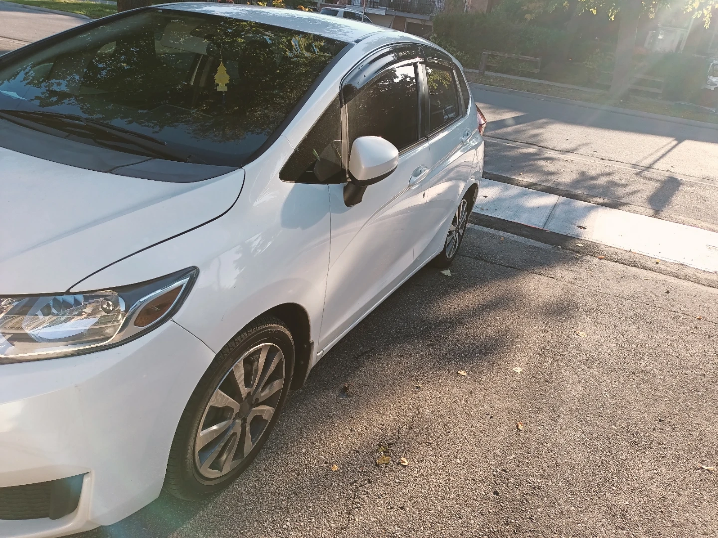 White Honda Fit hatchback. It's a four-door vehicle. Includes touch screen display,