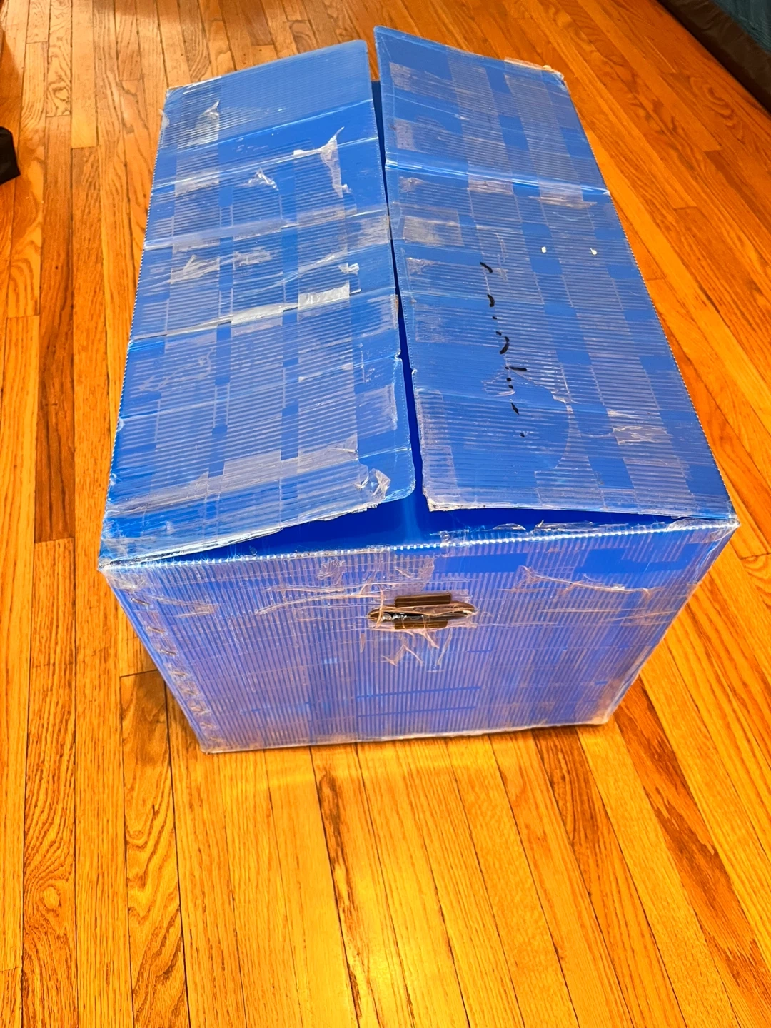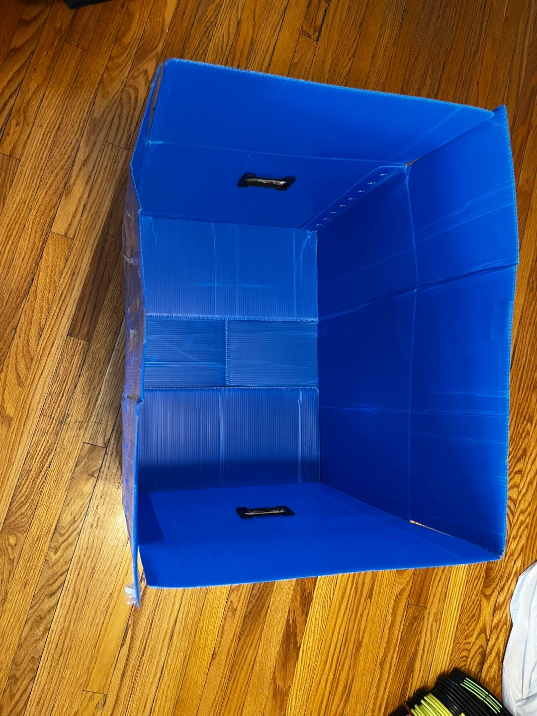Ten blue plastic storage, moving boxes .built-in handles for easy carrying. These reusable containers are great for organizing garages, basements, or moving items. They fold flat for convenient storage when not in use.