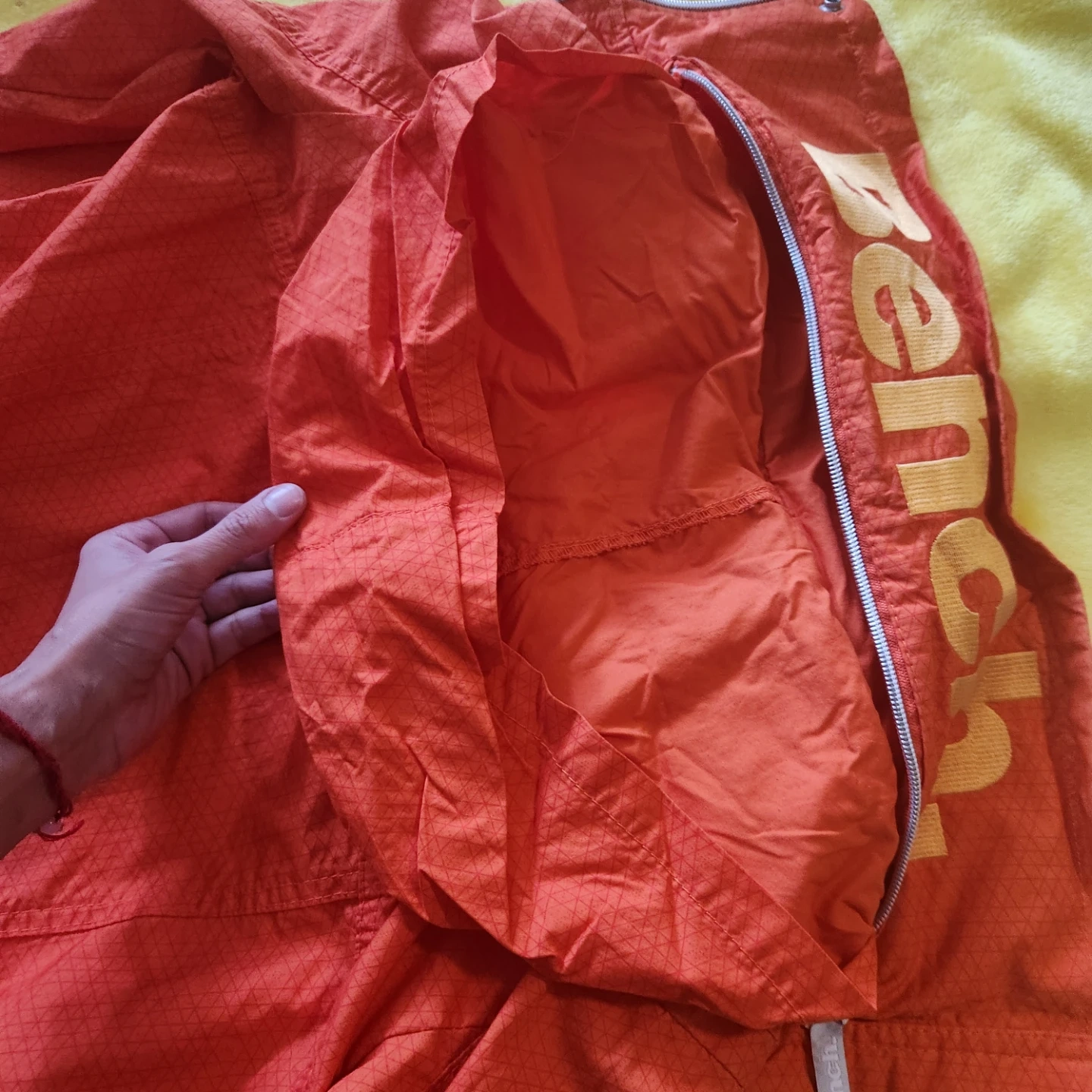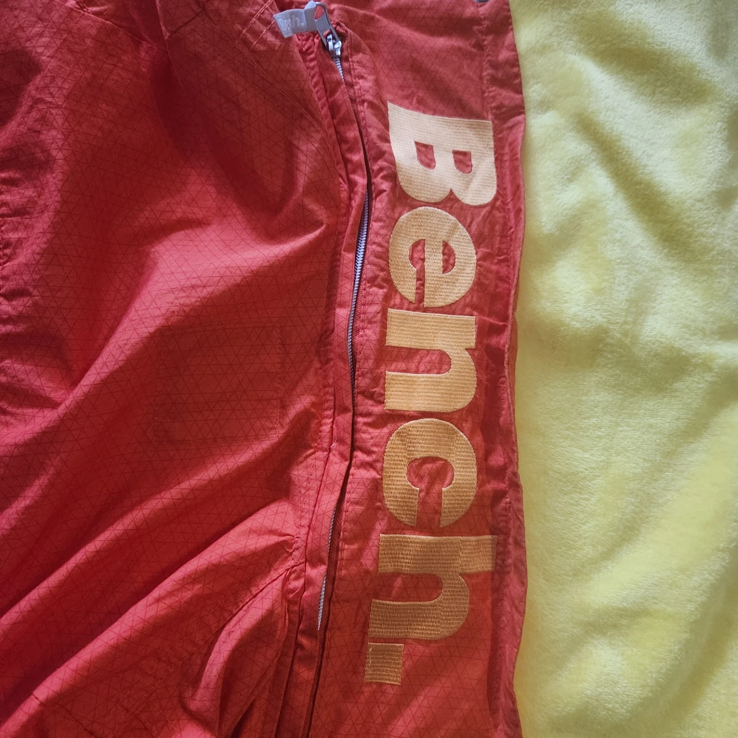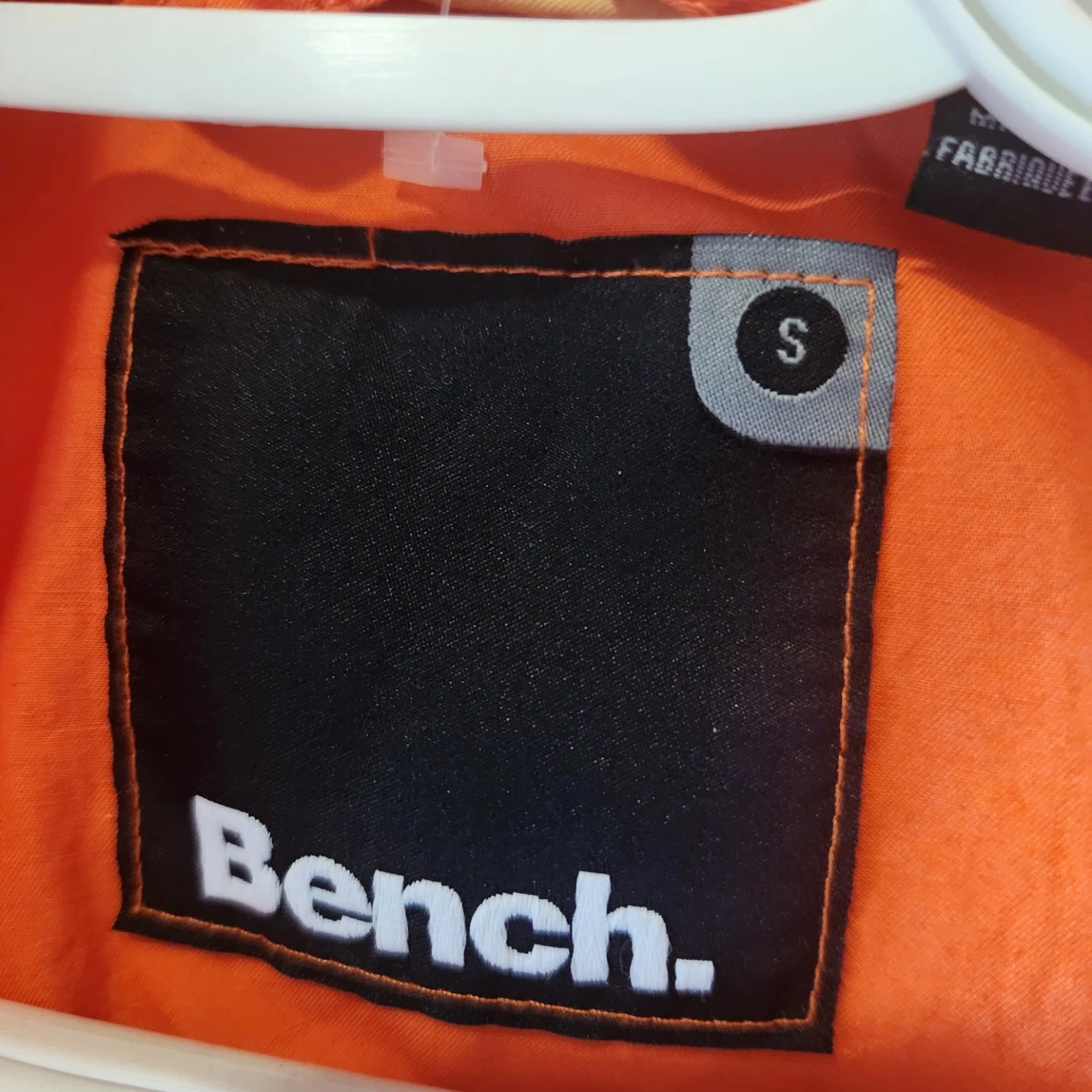 Orange Bench jacket with a full zip closure and a patterned fabric. It's a size small. Great for outdoor activities!
