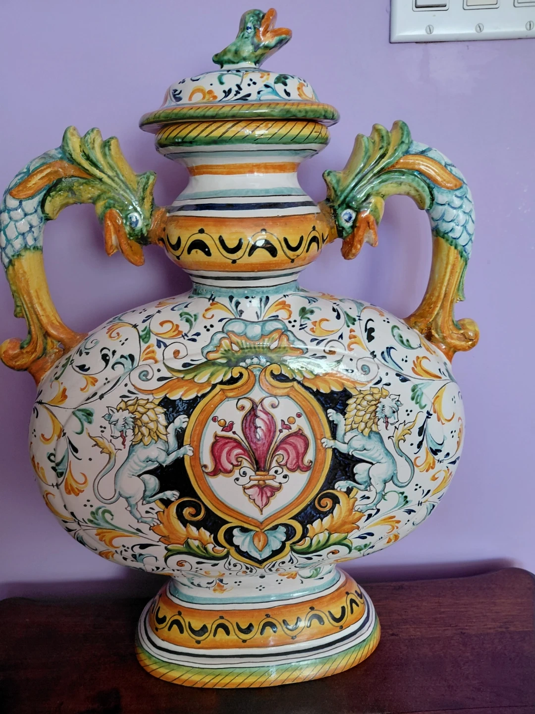 This is a striking, large ceramic vase featuring intricate hand-painted designs. It showcases two dramatic dragon-shaped handles and a central coat of arms adorned with lions and a fleur-de-lis. The detailed floral patterns and vibrant colors make it a standout decorative piece. It's perfect for adding a touch of classical artistry to any room!