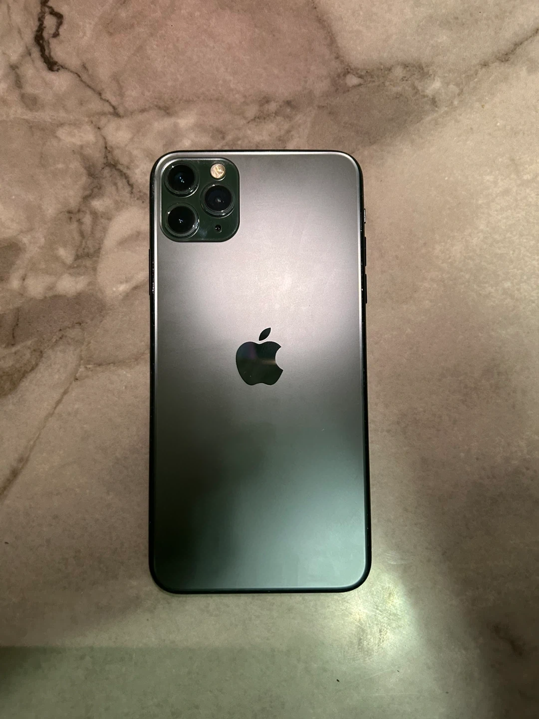 This is an Apple iPhone 11 Pro Max with 64 GB of storage. The battery health is reported at 100% capacity and comes with a case