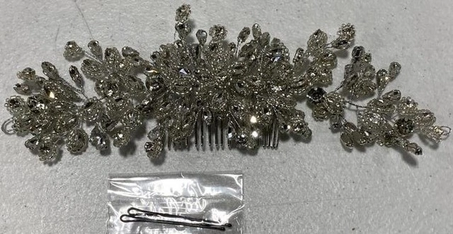Beautiful handmade wedding hair comb, perfect for brides, bridesmaids, or flower girls. Made with alloy, crystal, and beads, it stays securely in your hair. Can be worn on the side or at the back to complement your wedding veil. Approximately 9.5" long and 3.1" wide. Still in the original box. Located in Summerside. Smoke-free home. Message to arrange pickup.