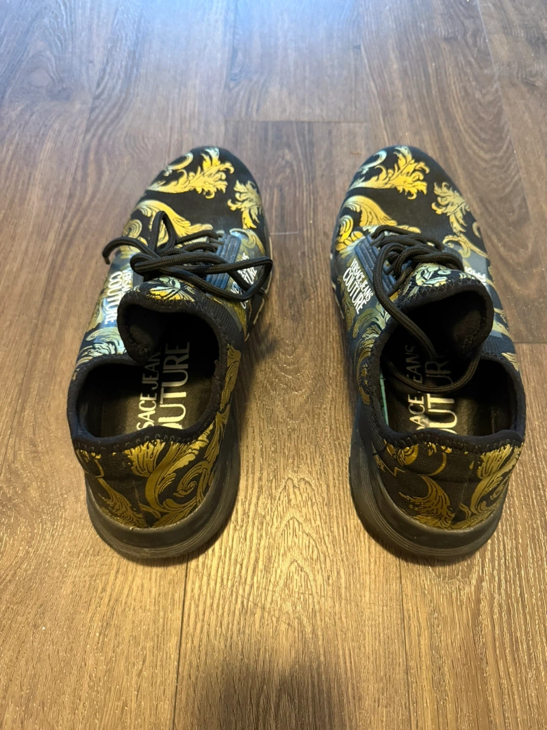 These Versace Jeans Couture sneakers feature a striking black and gold baroque print. They have a lace-up closure and the brand's signature logo details. A bold statement piece for any streetwear collection!