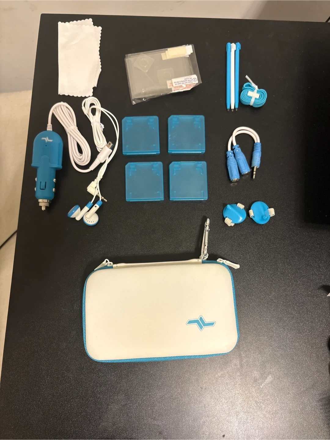 This kit includes a variety of accessories for portable electronics. It has a car charger, earbuds, and adapters. The package comes with a protective carrying case and cleaning cloth. It's great for keeping your devices powered and protected on the go!