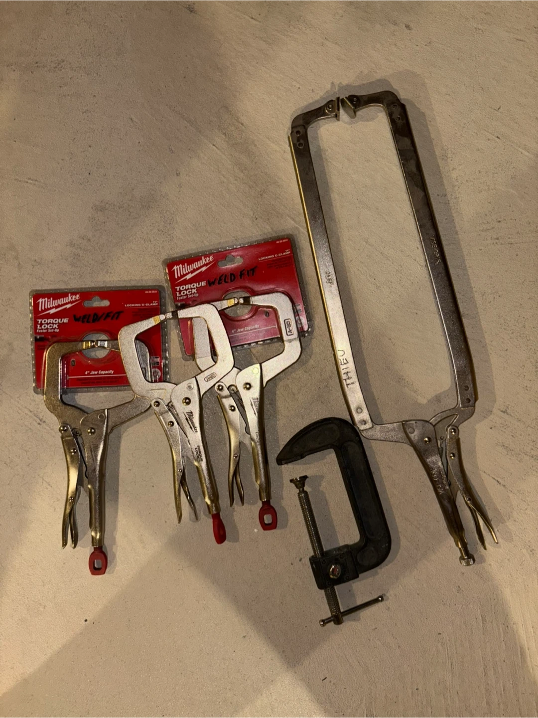 Two Milwaukee Torque Lock C-Clamps and a generic C-clamp. One Milwaukee clamp is still in its original packaging. These clamps offer secure locking for various workshop tasks.