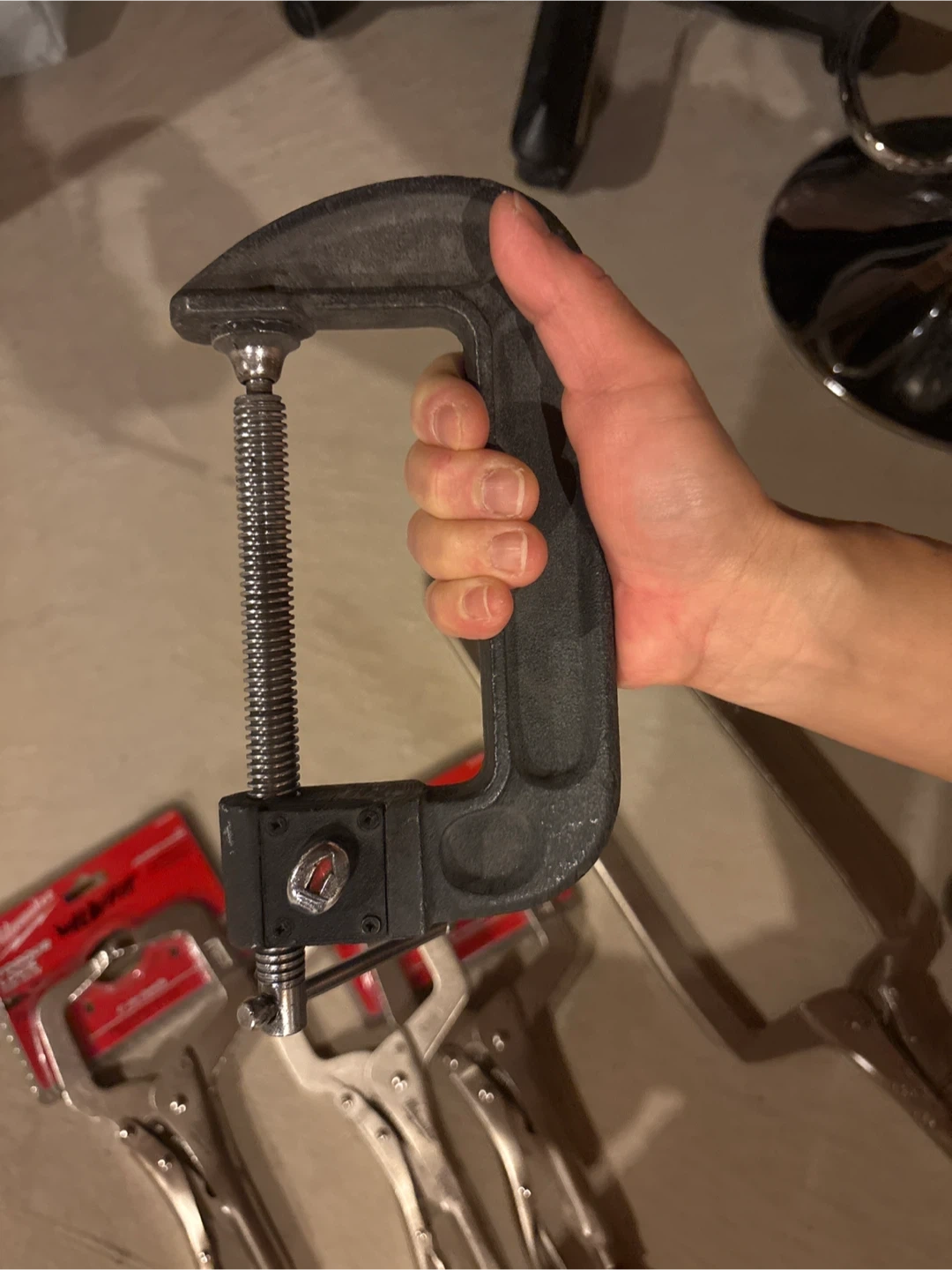Two Milwaukee Torque Lock C-Clamps and a generic C-clamp. One Milwaukee clamp is still in its original packaging. These clamps offer secure locking for various workshop tasks.