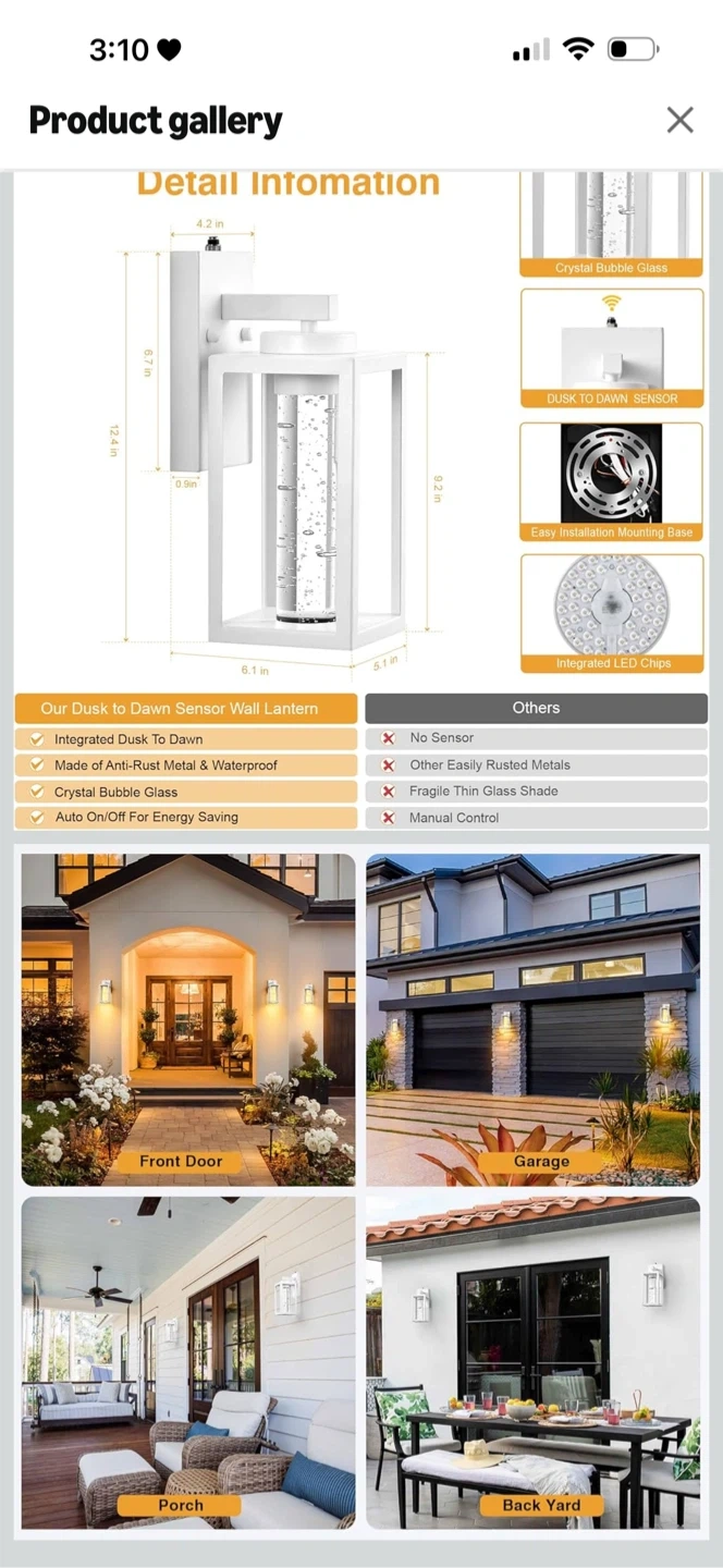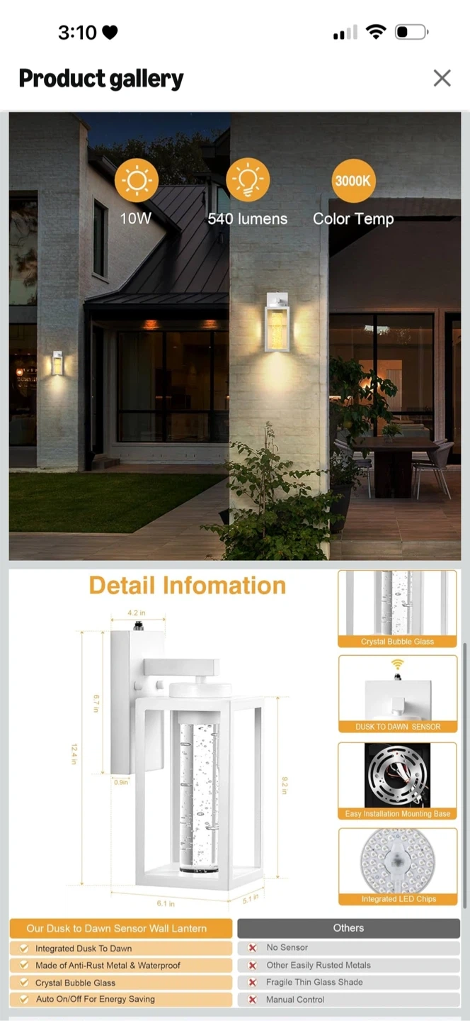These VIANIS LED outdoor wall sconces come in a 2-pack. They feature a dusk to dawn photocell sensor for automatic operation. Includes bubble glass inserts for a stylish look.
