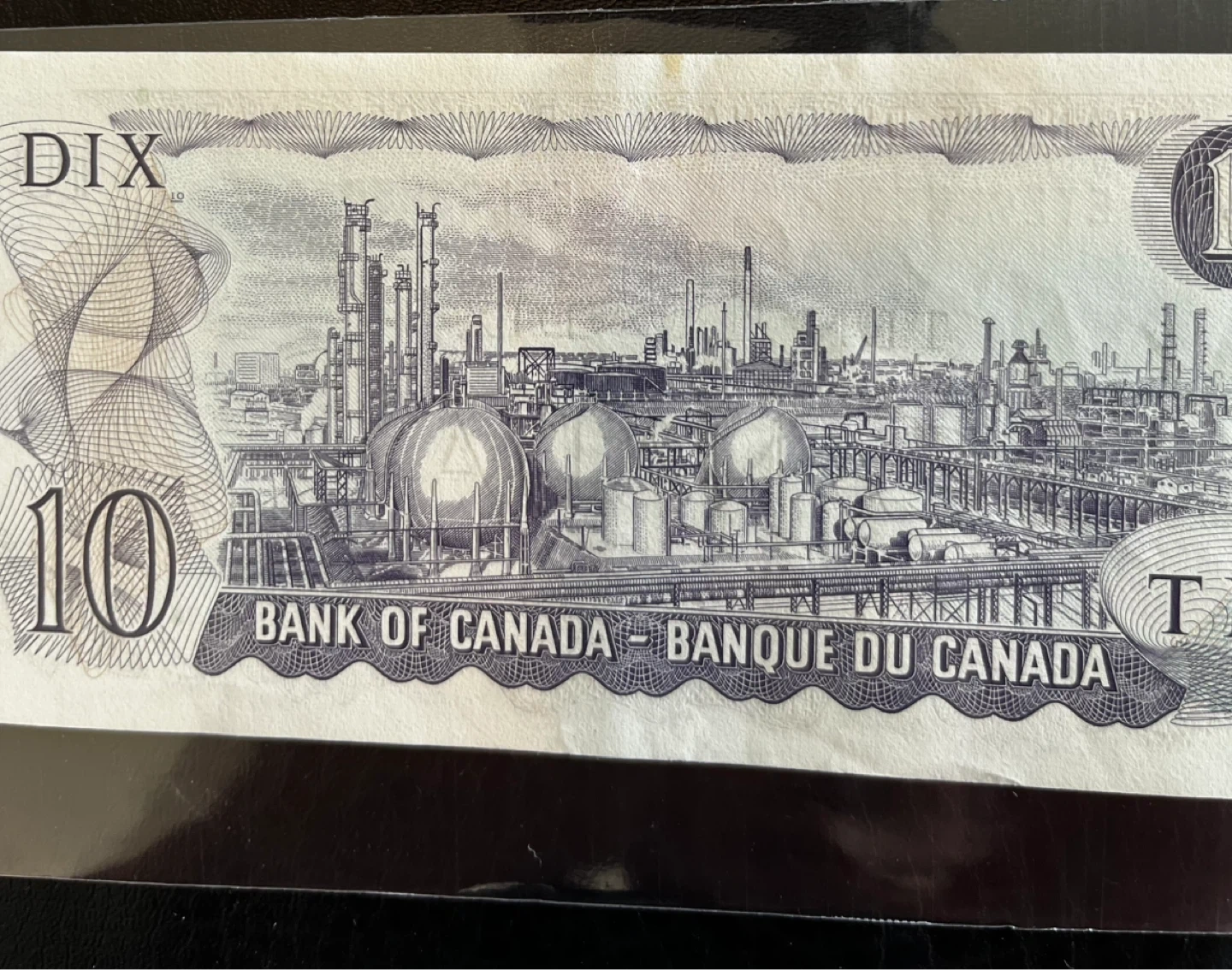 Design Subject: The scene depicted is an industrial refinery, specifically the Polymer Corporation plant located in Sarnia, Ontario. This is a 10 dollar bill from the Bank of Canada. It features Sir John A. Macdonald on the front and a refinery scene on the back. The note is legal tender and was printed in Ottawa in 1971.