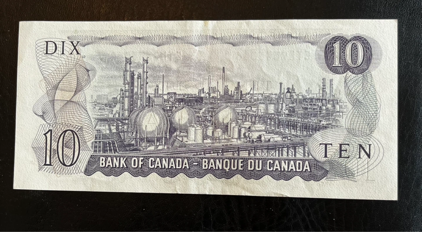 Design Subject: The scene depicted is an industrial refinery, specifically the Polymer Corporation plant located in Sarnia, Ontario. This is a 10 dollar bill from the Bank of Canada. It features Sir John A. Macdonald on the front and a refinery scene on the back. The note is legal tender and was printed in Ottawa in 1971.