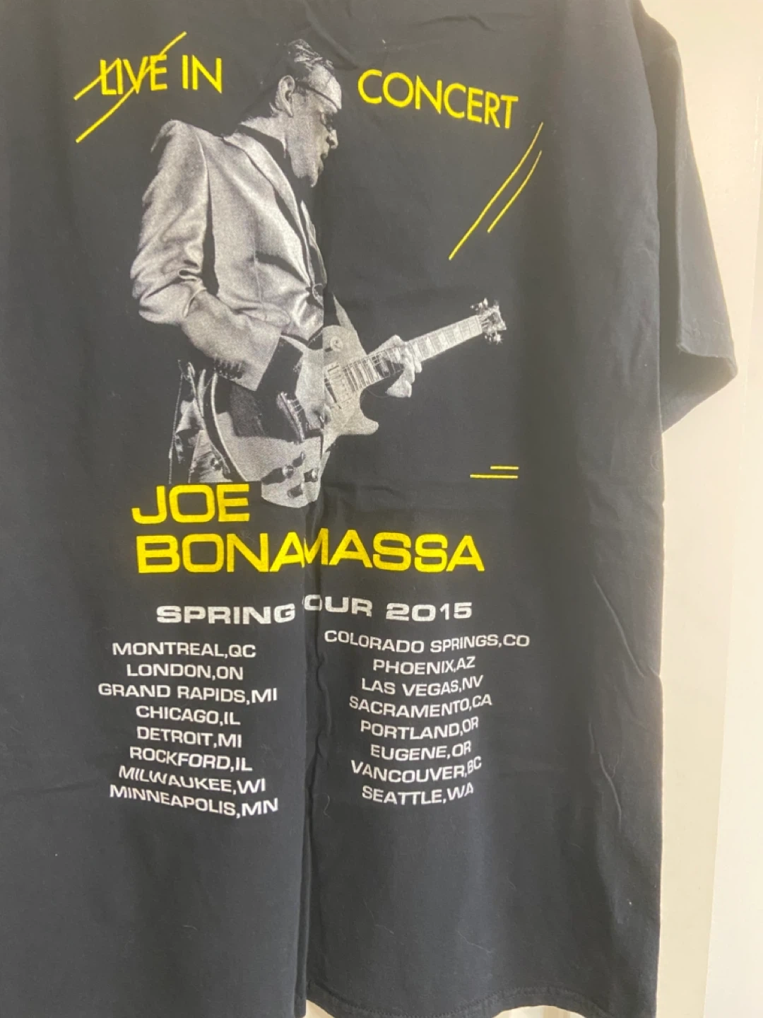 Black t-shirt featuring Joe Bonamassa with his guitar and "Live in Concert" tour details from Spring Tour 2015. This shirt showcases the artist and lists tour dates from across North America. sz L