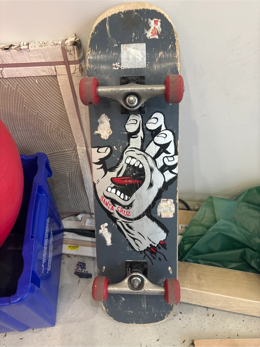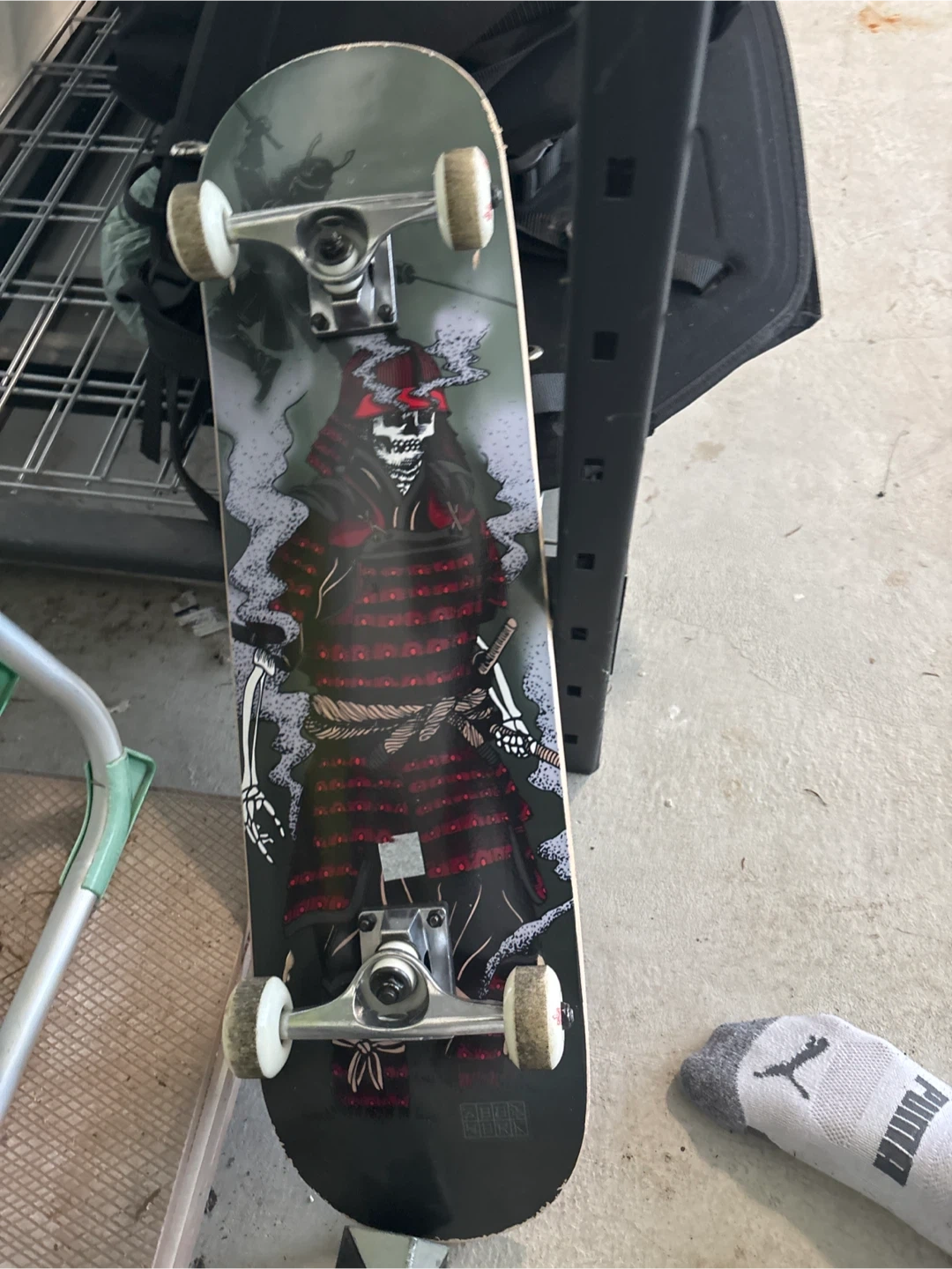 Two skateboards with skull and hand graphics. One is branded Zero and the other is Santa Cruz. Both show signs of use. These decks are ready for street skating.Each 39$ except the samurai one that one is 80$ it’s new
