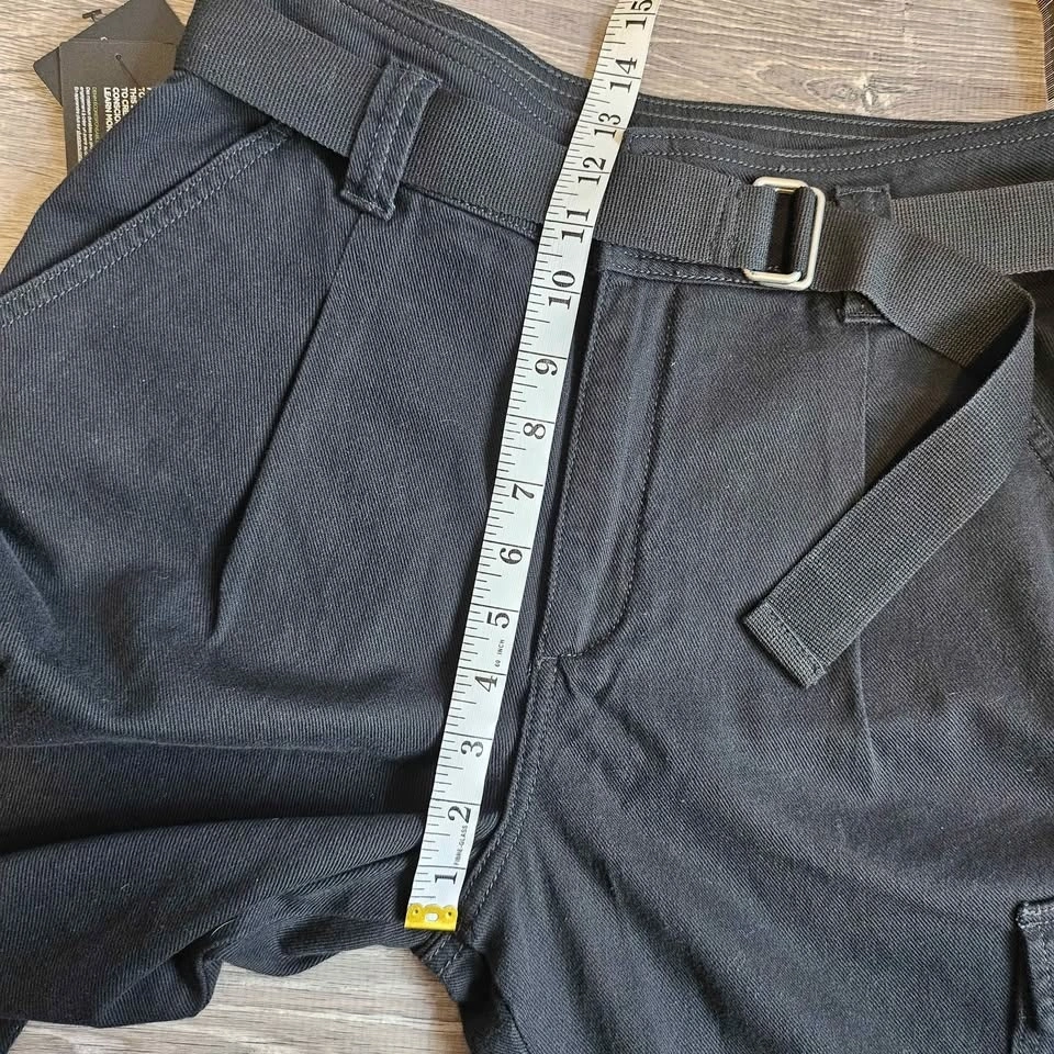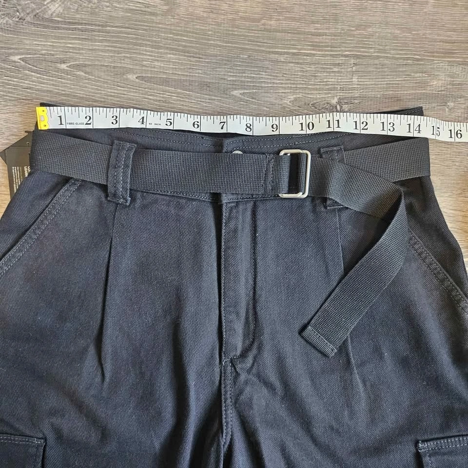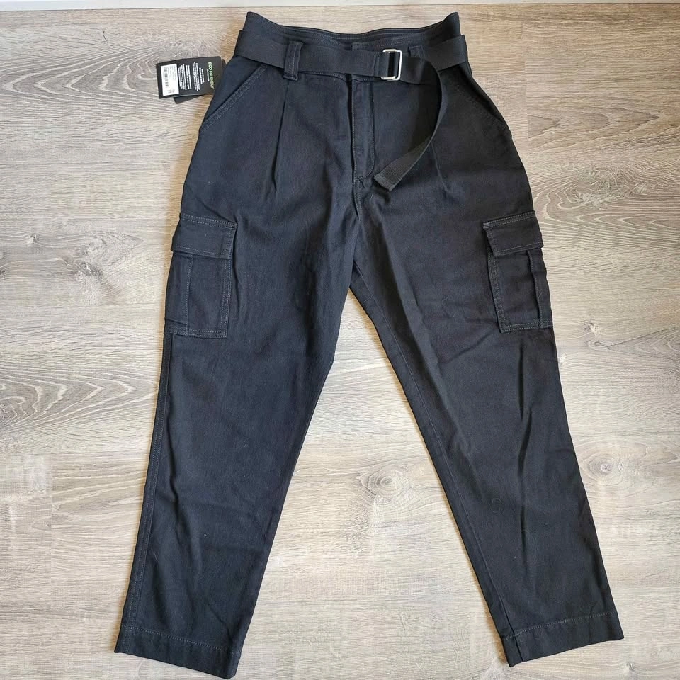 They feature a utility-inspired design with a high waist, front pleats, and tapered legs. You'll find classic flap snap closure cargo pockets on the thighs. A matching fabric belt with antique nickel buckles is included and can be removed. The tag mentions they are eco-friendly.