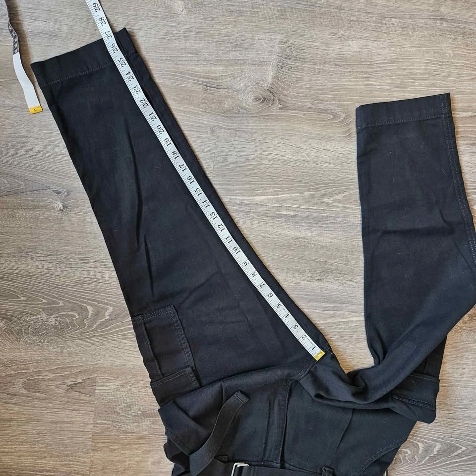 Measurements taken with the pants laid flat are: waist 14.5", rise 13", inseam 27", pant leg width near cuff 7", and upper pant leg width 12.5".