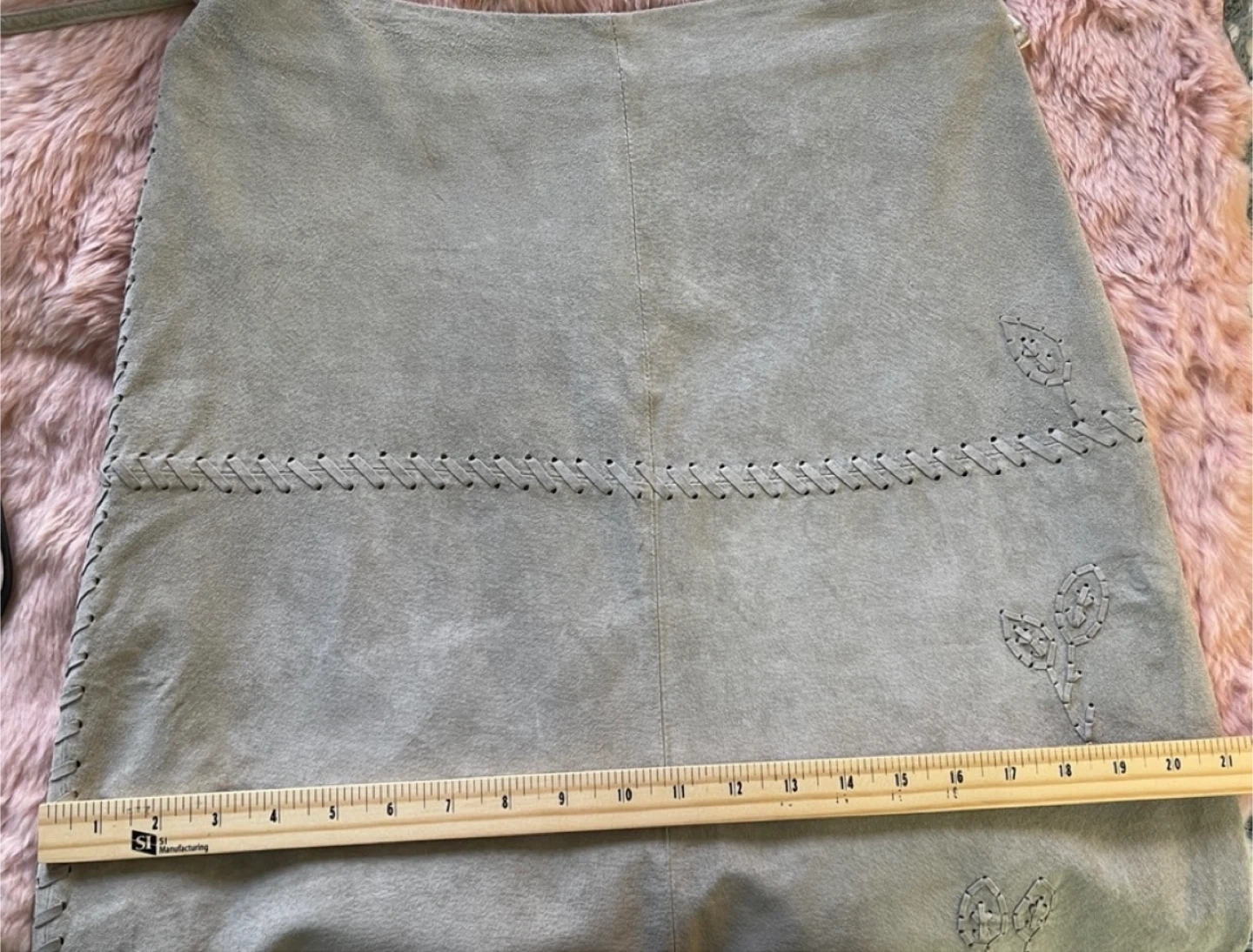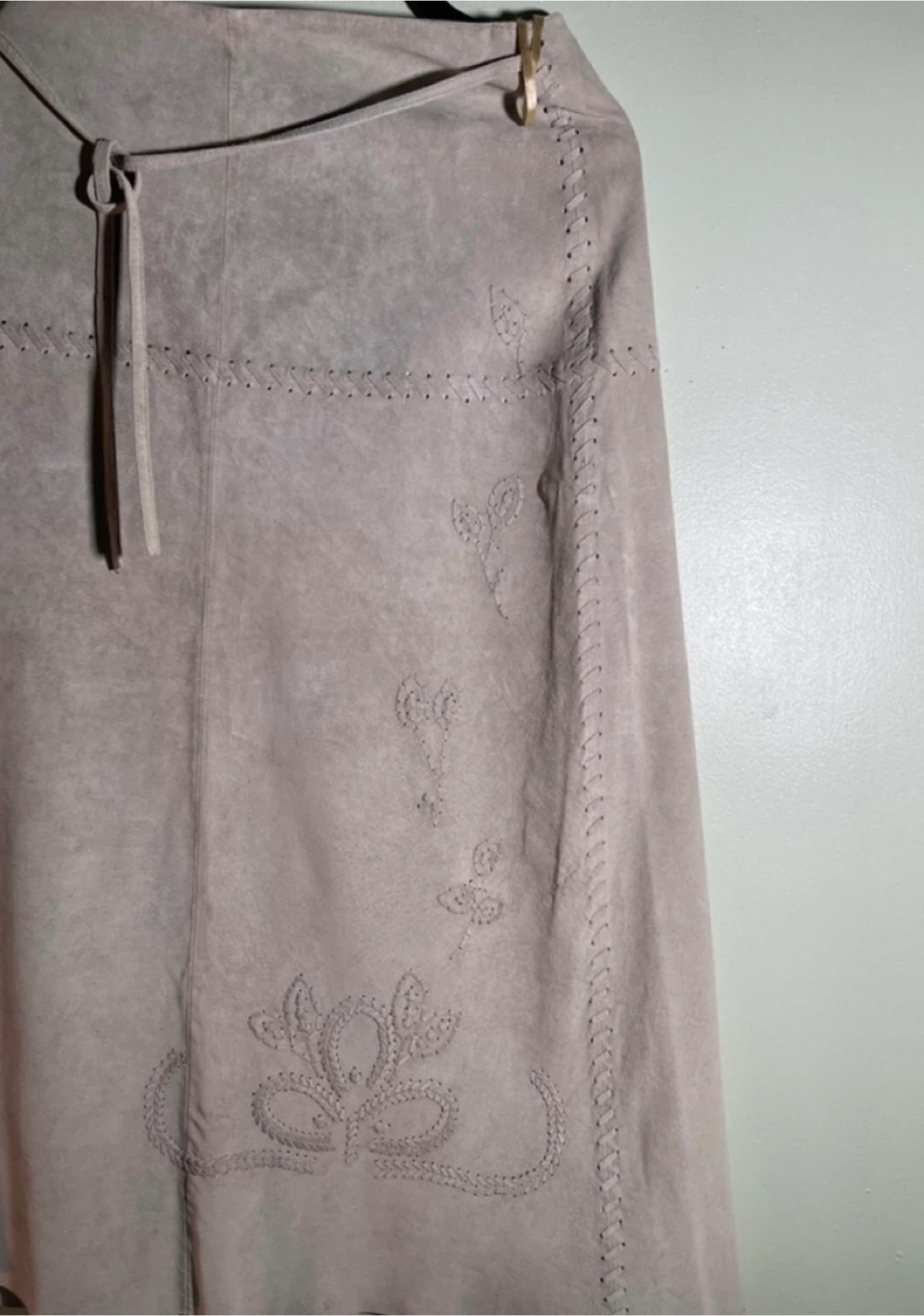 Beautiful vintage Tristam & Iseult midi skirt in a soft taupe / grey suede-look finish, featuring decorative whipstitch seams and embroidered floral motifs throughout.