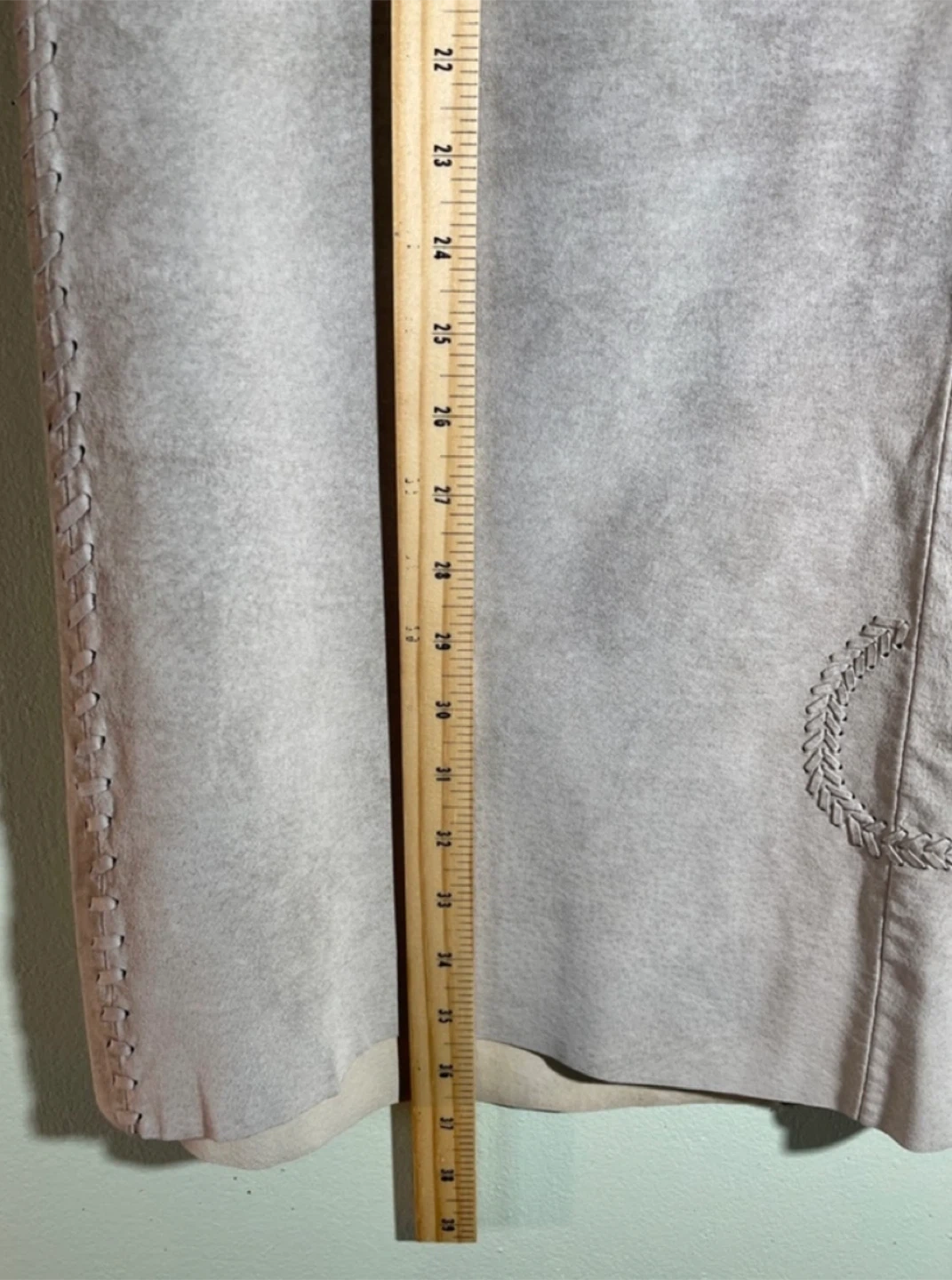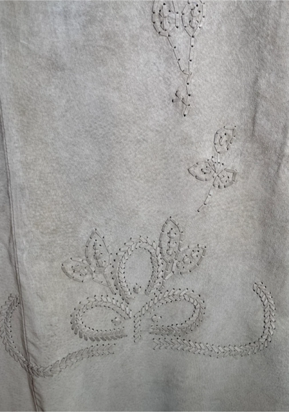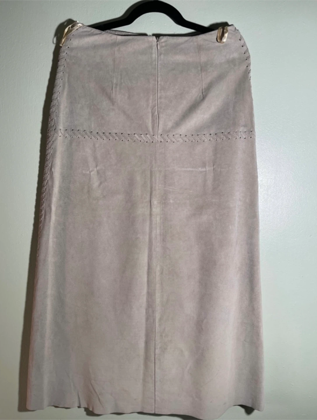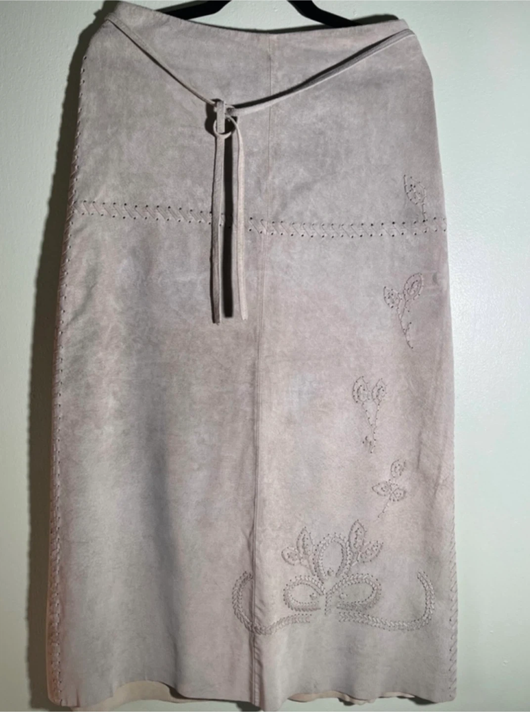 Beautiful vintage Tristam & Iseult midi skirt in a soft taupe / grey suede-look finish, featuring decorative whipstitch seams and embroidered floral motifs throughout.