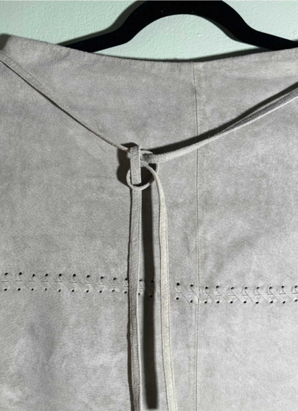 A timeless vintage piece that pairs beautifully with knits, boots, or a fitted top for an effortless boho or minimalist look.