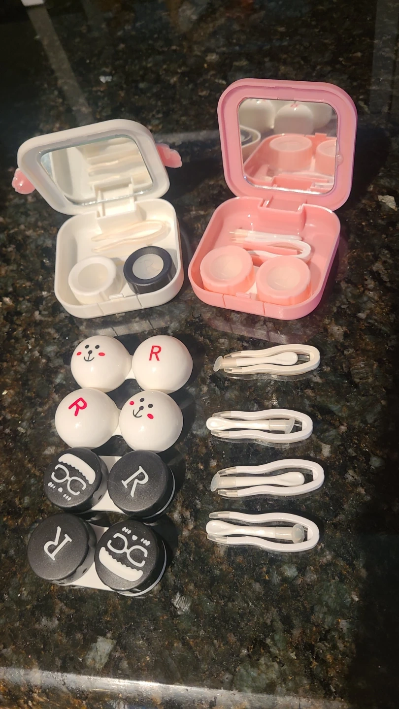 This set includes two cute contact lens cases with mirrors and accessories. It comes with multiple lens holders and tweezer tools for convenience. Perfect for travellers or anyone who wants to keep their lenses organised in style!