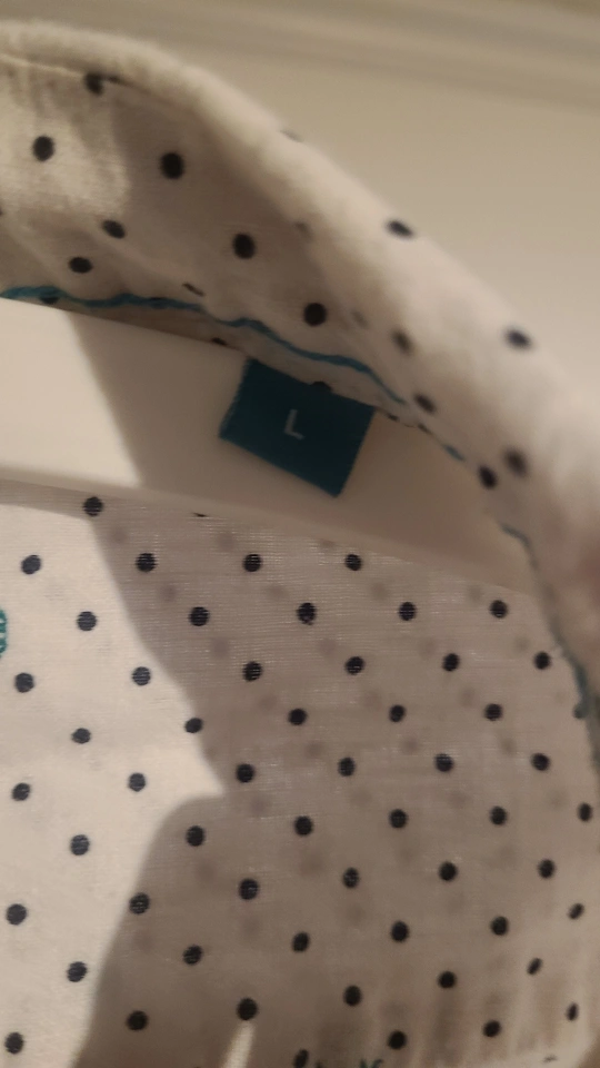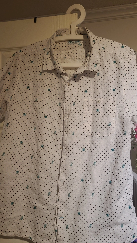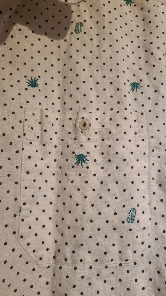 White short-sleeve button-up shirt from Tenth + Ocean. It features a fun black polka dot and cactus pattern. Size is large.