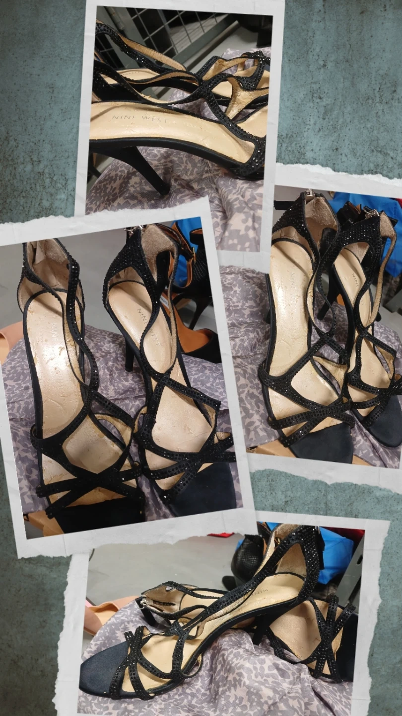 Black Nine West stiletto heels adorned with rhinestones. These strappy sandals feature a classic heel design and a zipper closure at the back. They're perfect for dressing up any outfit for a night out! Size 7 1/2