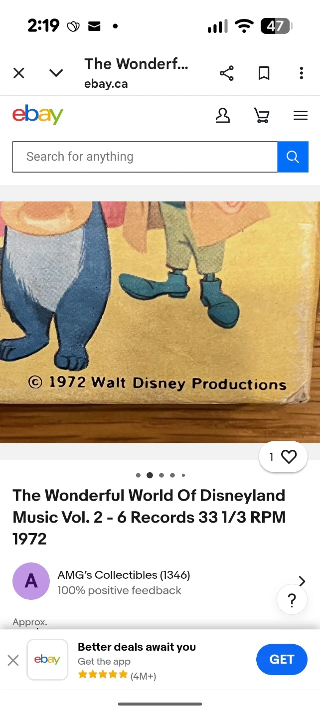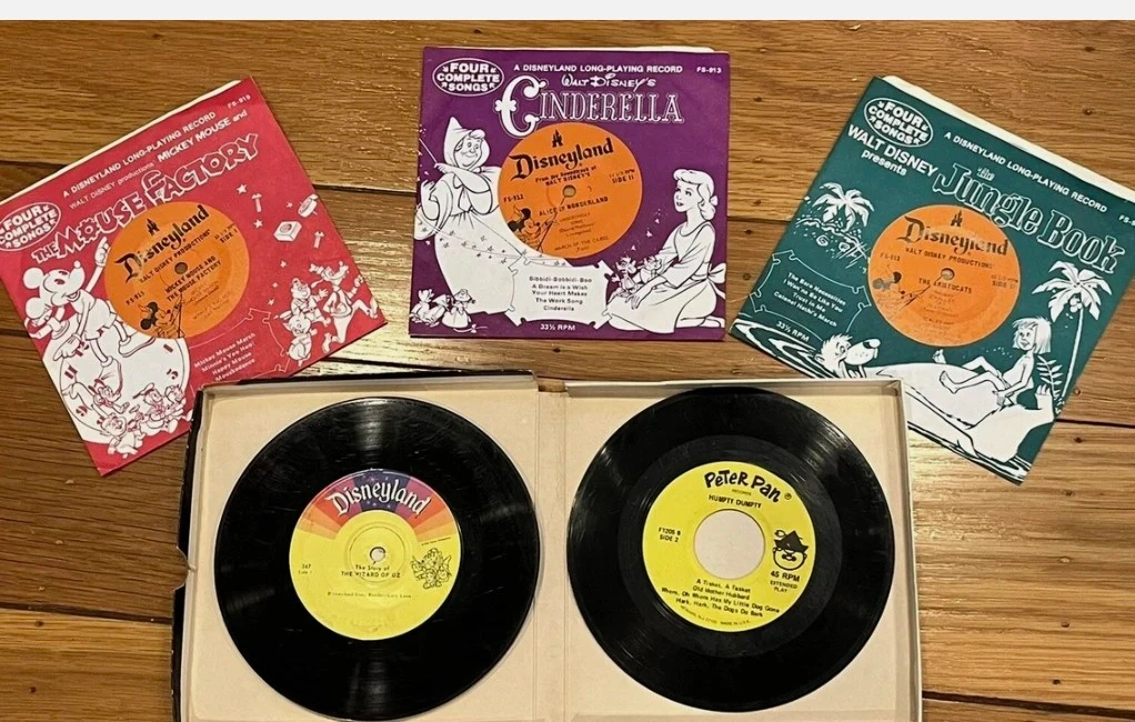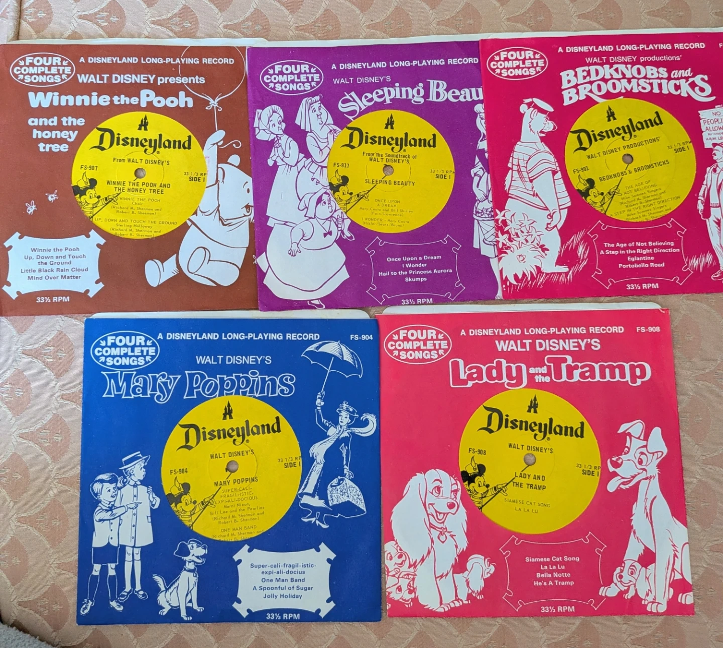 This volume 2 collection features 6 long-playing records with 24 complete songs from Walt Disney. Records are 33 1/3 RPM. Copyright 1972 Walt Disney Productions. Plus 5 additional records from volume 1