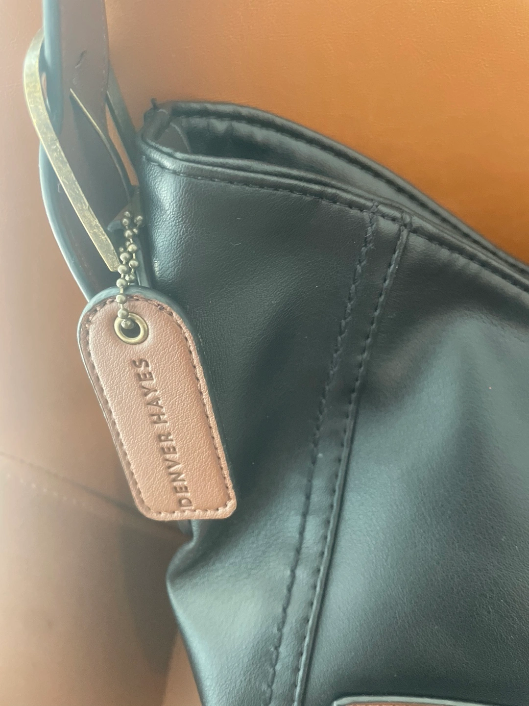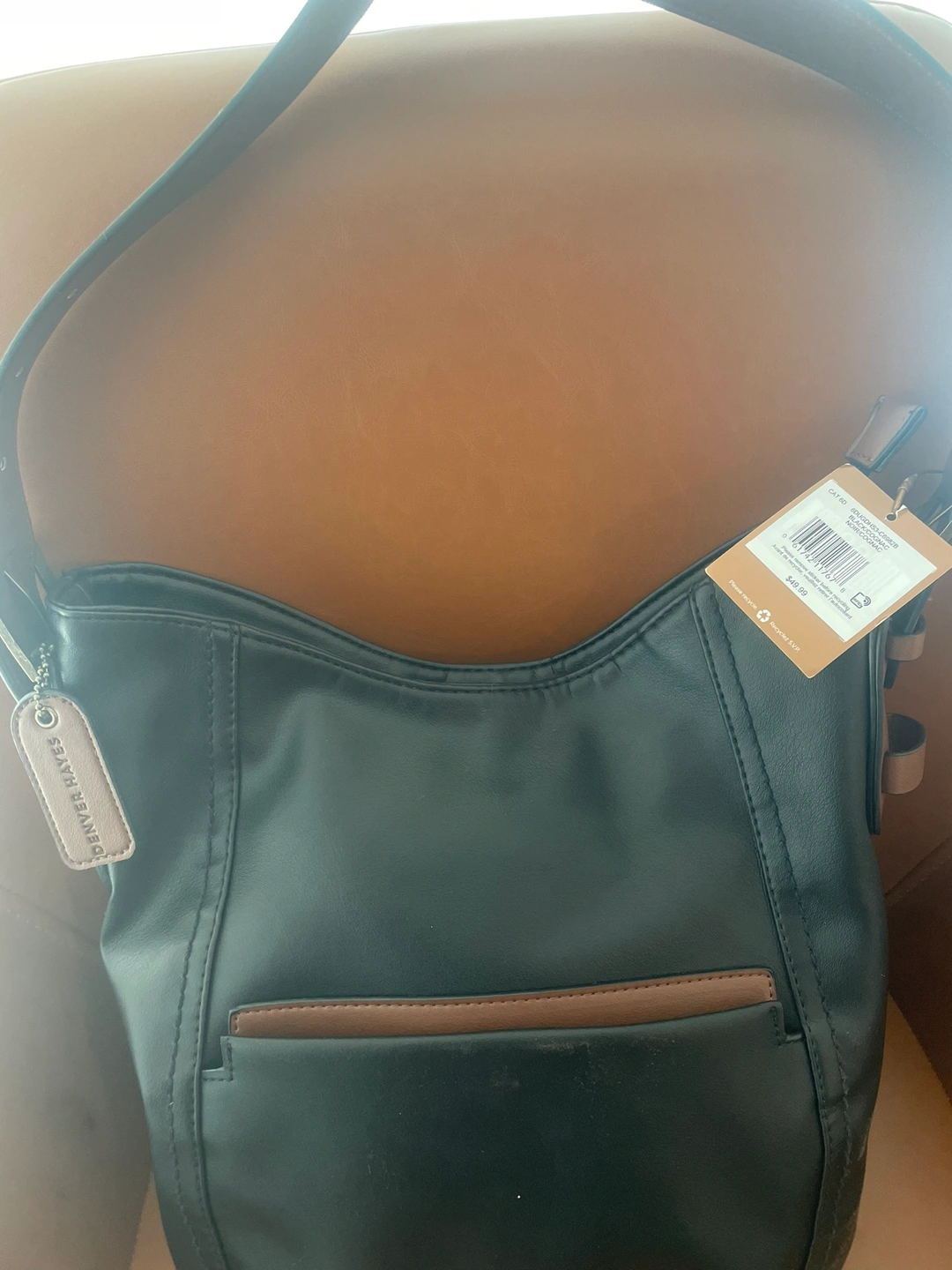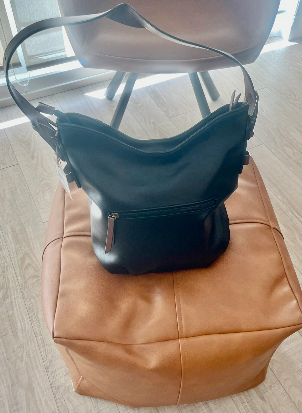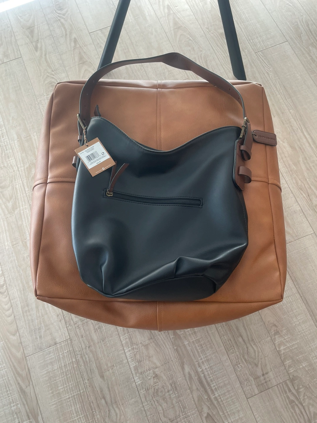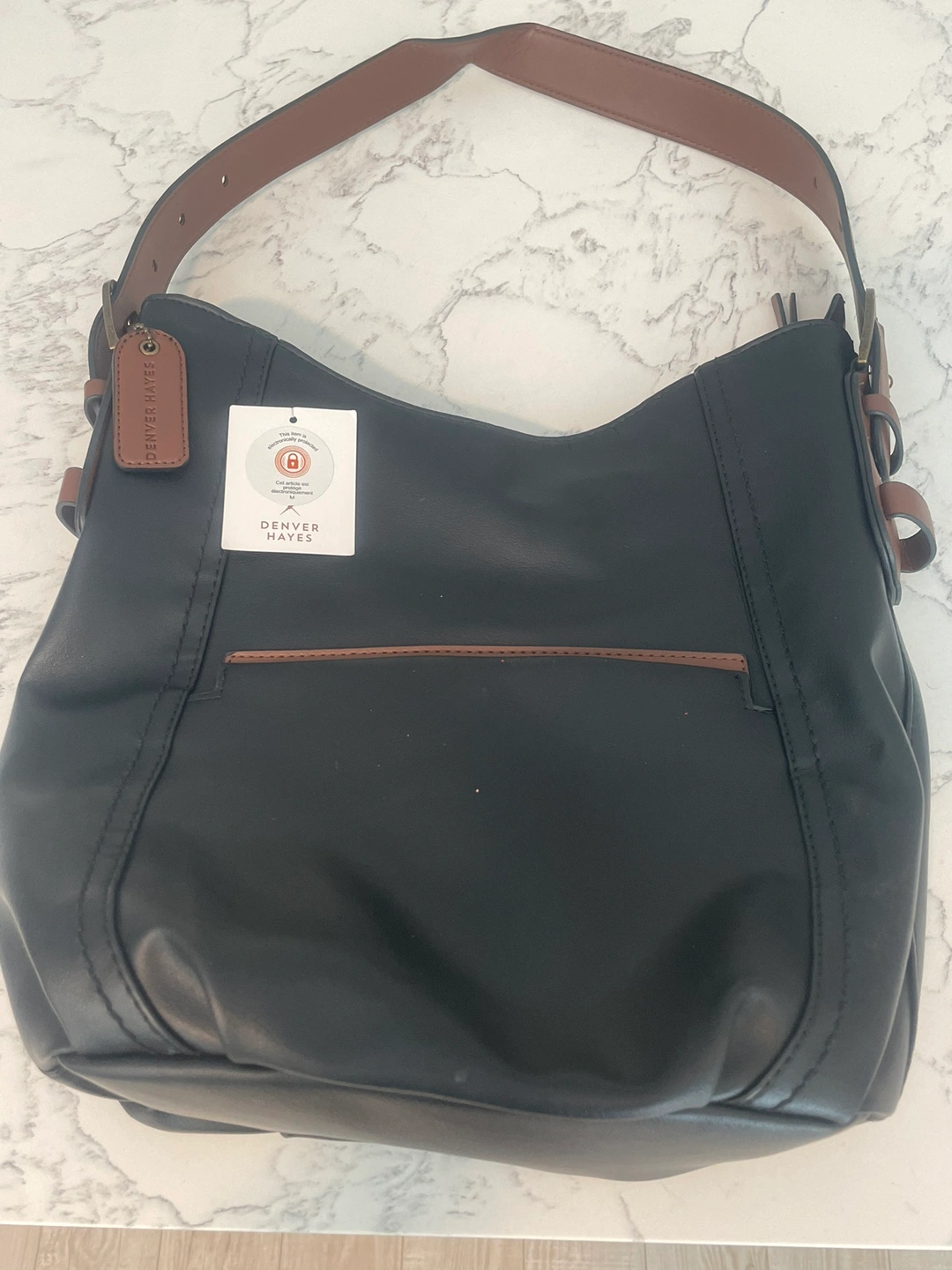 Cognac and black handbag, features multiple pockets inside and out so you can organize your daily essentials. Contrast elements add a stylish look and the handle is adjustable to suit your needs. Primary Material: Polyurethane.