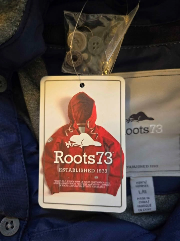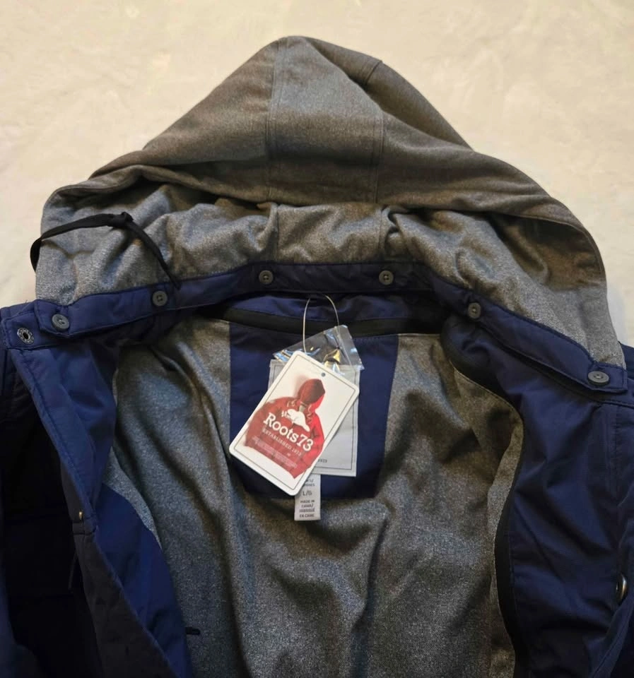 New navy Roots jacket with grey lining and removeable hood. Snap closure and cinch hood.