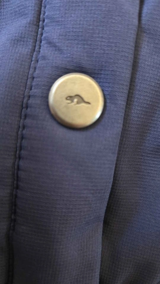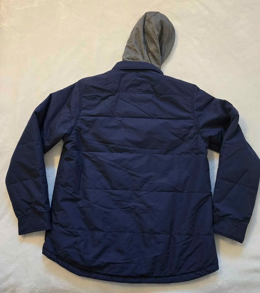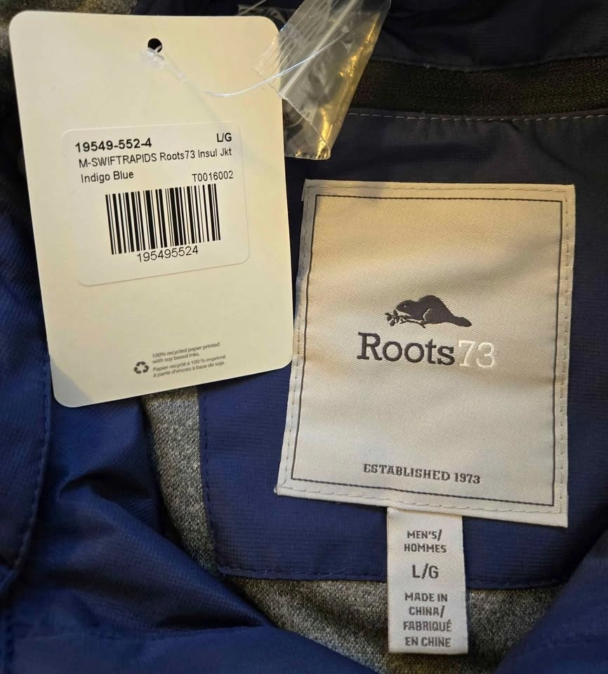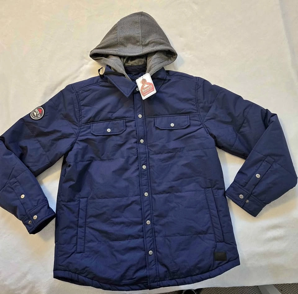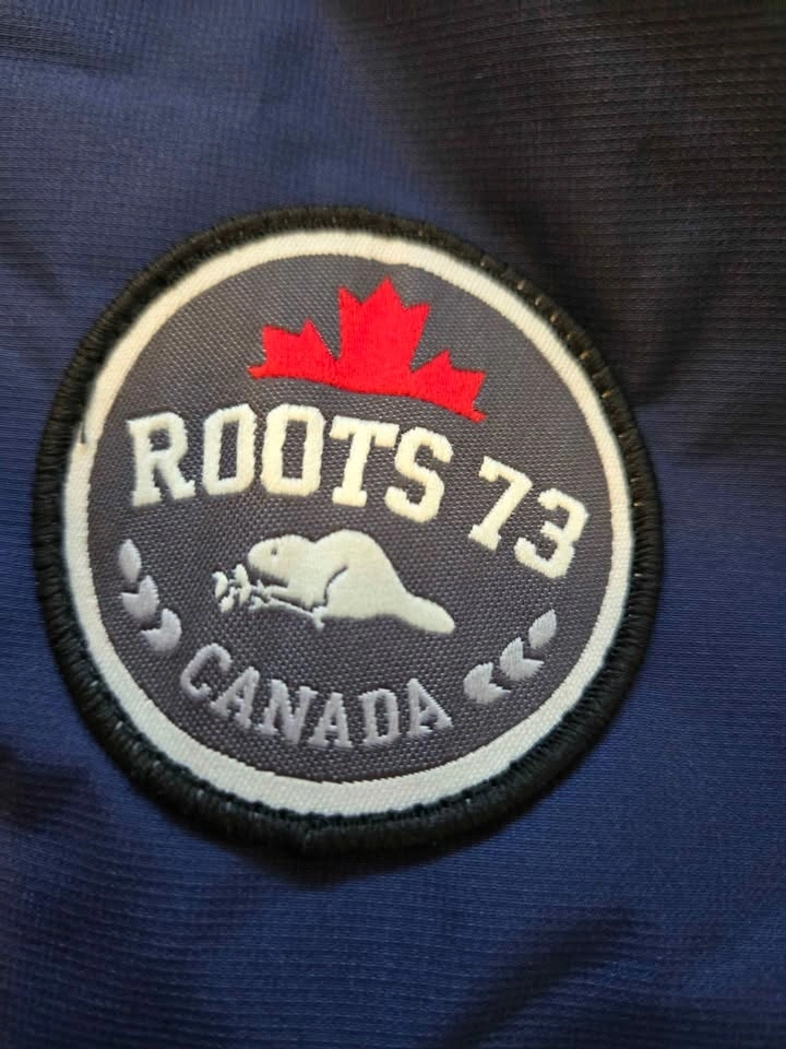 New navy Roots jacket with grey lining and removeable hood. Snap closure and cinch hood.