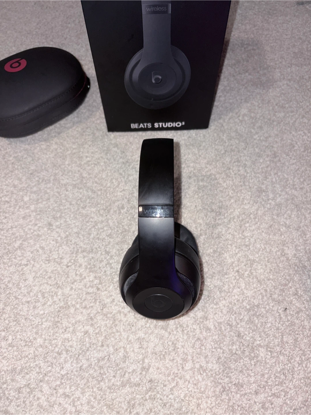 These Beats Studio³ wireless headphones come in a sleek matte black finish. They feature active noise cancellation and include the original box and carrying case. Enjoy premium sound quality with these over-ear headphones.