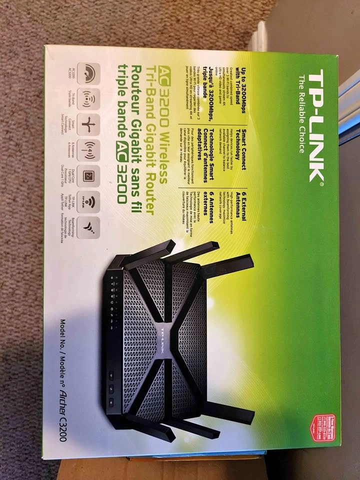 Never used TP LINK AC3200 wireless router. I thought I would need it to extend the WiFi range in my home but didn't end up using it.