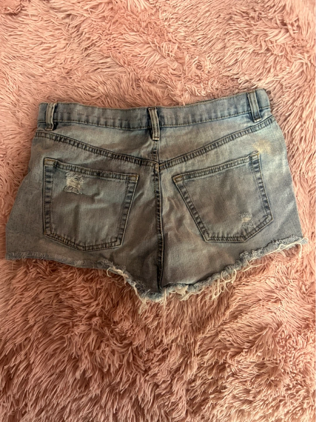 Chelsea brand light wash denim shorts. They feature a distressed, ripped design with a frayed hem. Size 7.