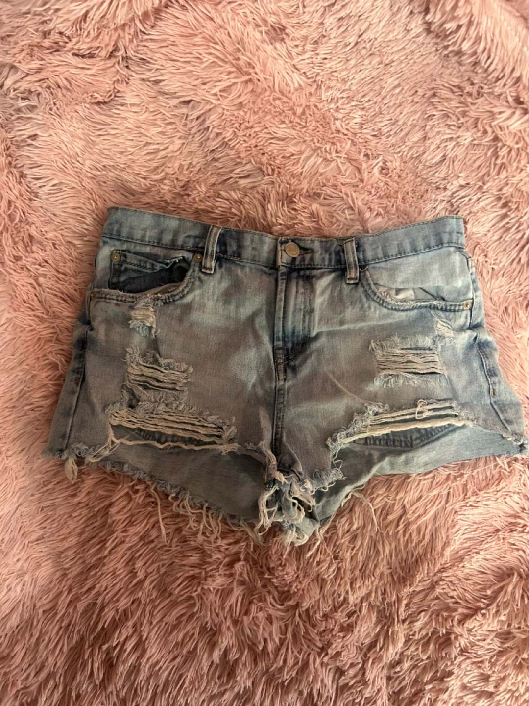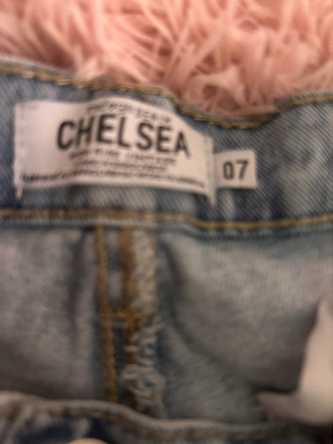 Chelsea brand light wash denim shorts. They feature a distressed, ripped design with a frayed hem. Size 7.