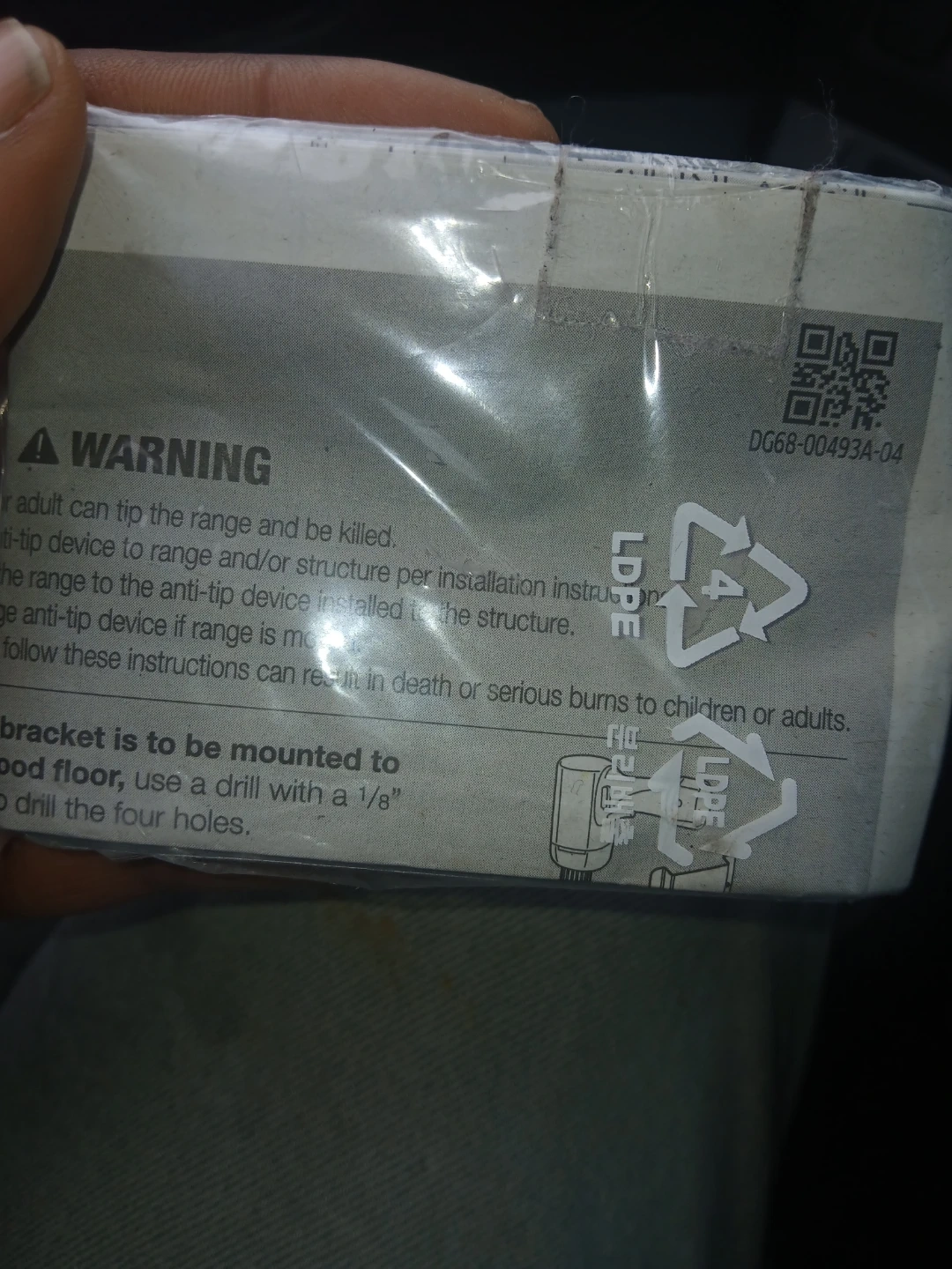 This kit includes an anti-tip bracket and screws for securing a range to the floor. It's designed to prevent tipping, which can be a serious safety hazard. Instructions mention drilling four holes for mounting.
