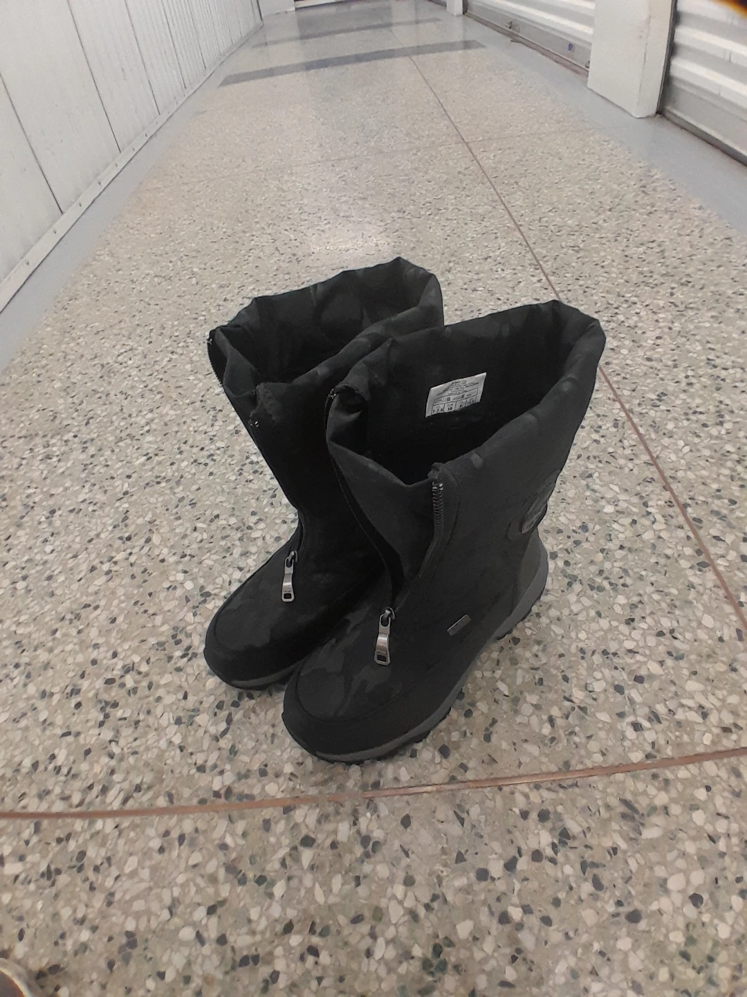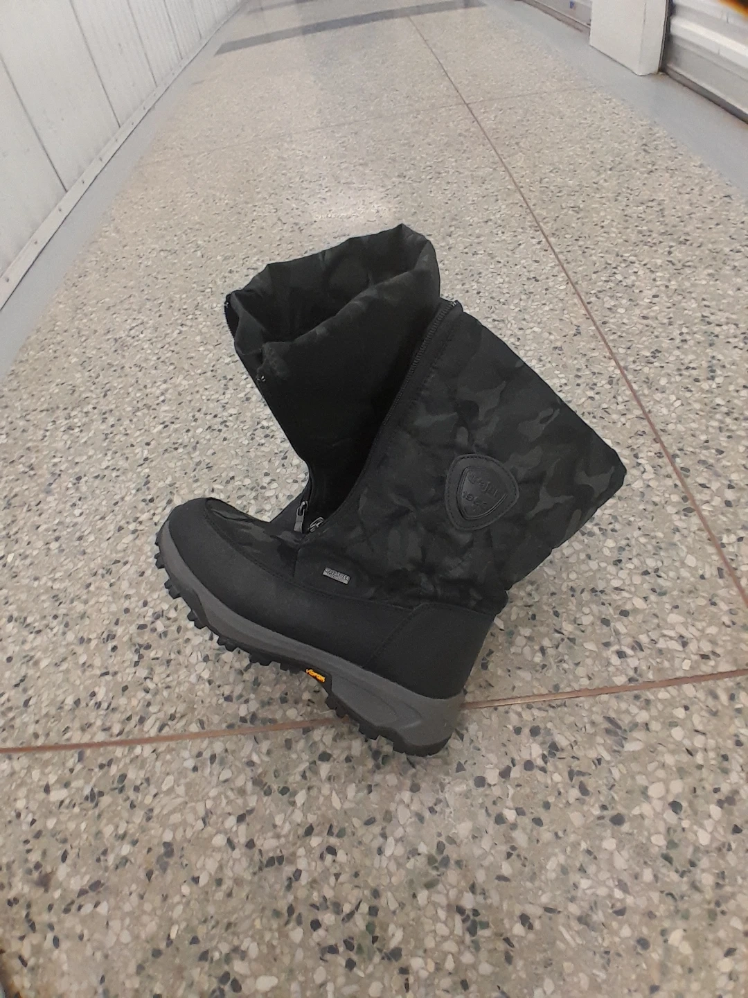 These black winter boots feature a cool camouflage pattern. They're designed for warmth and traction in snowy conditions. Water-resistant exterior original Pajar Women's size 8
