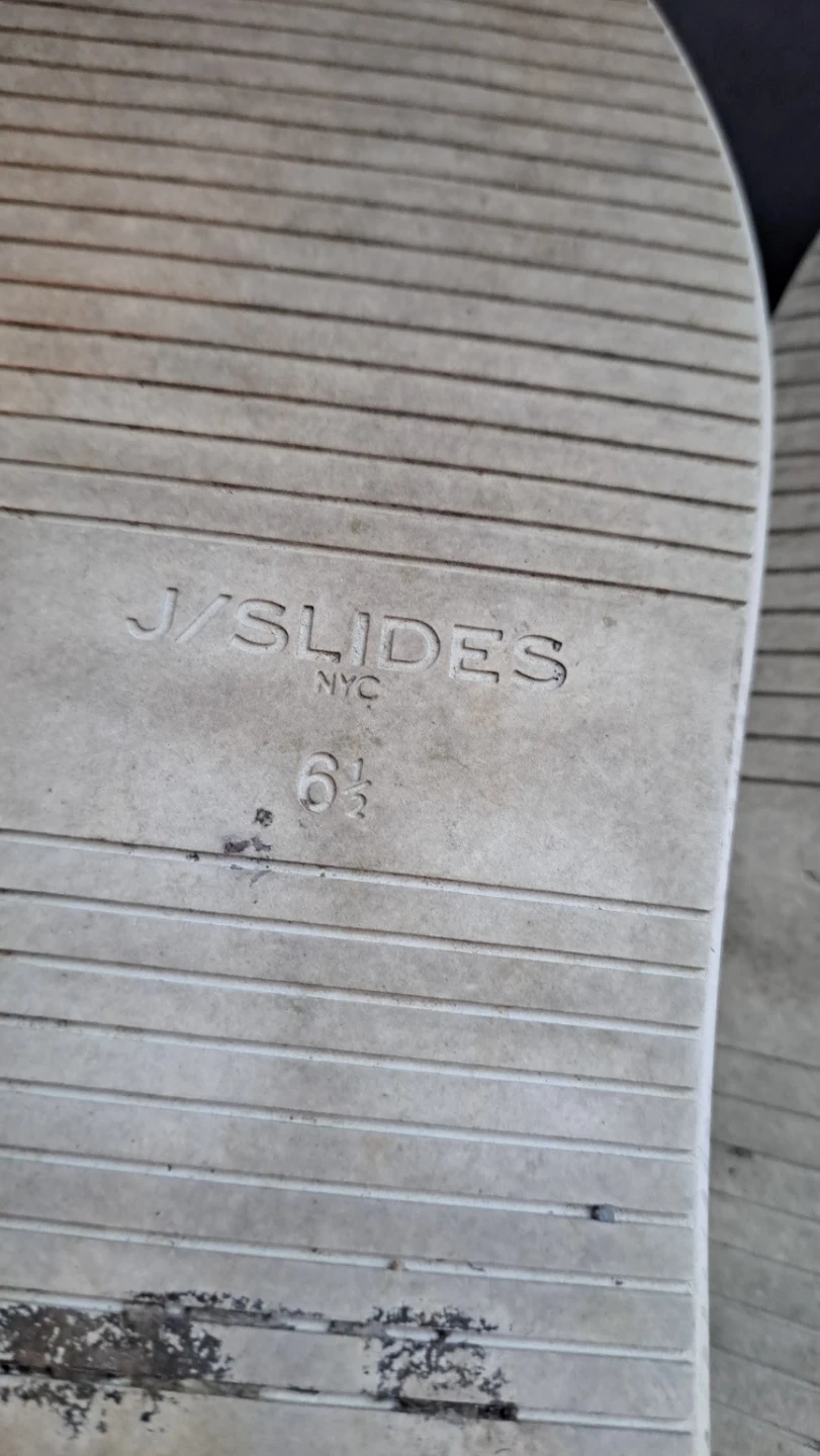 Comfortable J/SLIDES NYC slip-on sneakers in a black / metallic finish. These size 6.5 shoes feature a classic slip-on design with a sturdy white sole. Great for summer.