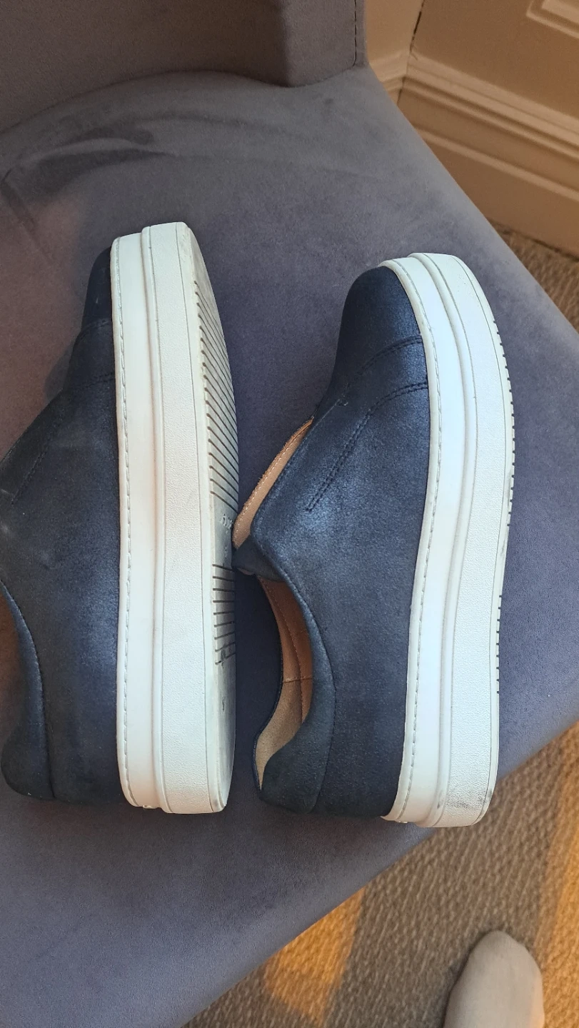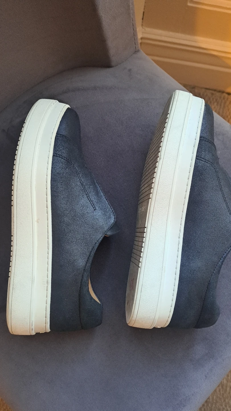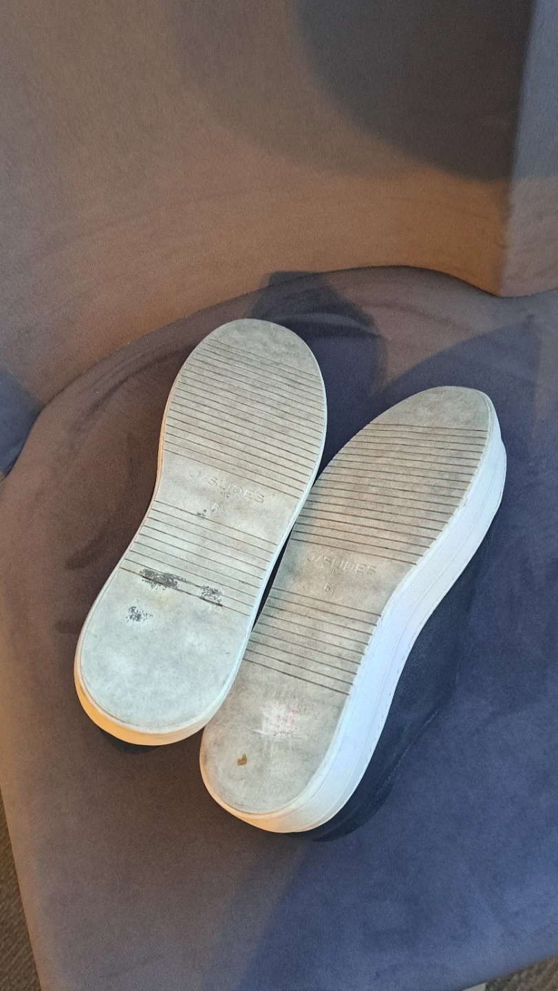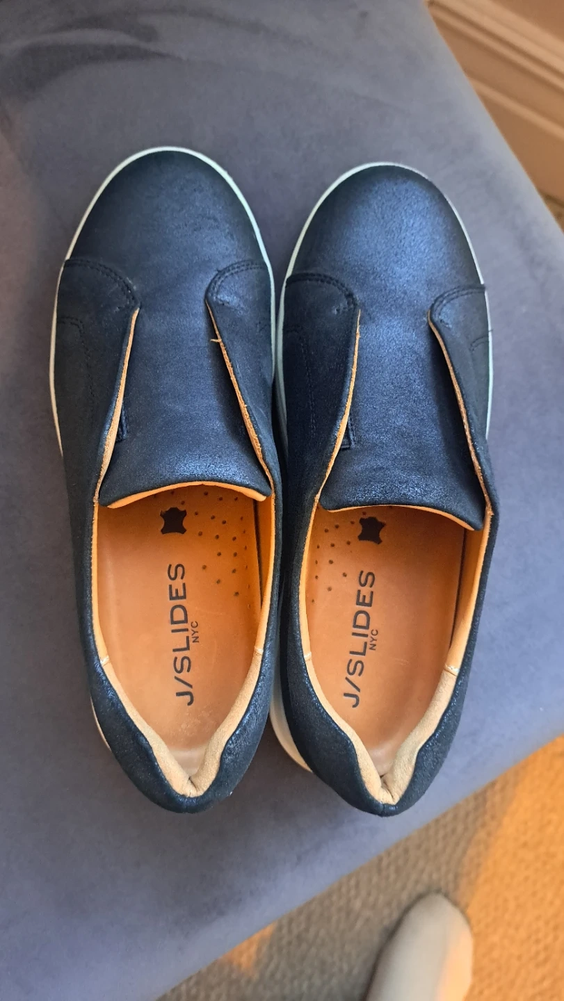 Comfortable J/SLIDES NYC slip-on sneakers in a black / metallic finish. These size 6.5 shoes feature a classic slip-on design with a sturdy white sole. Great for summer.