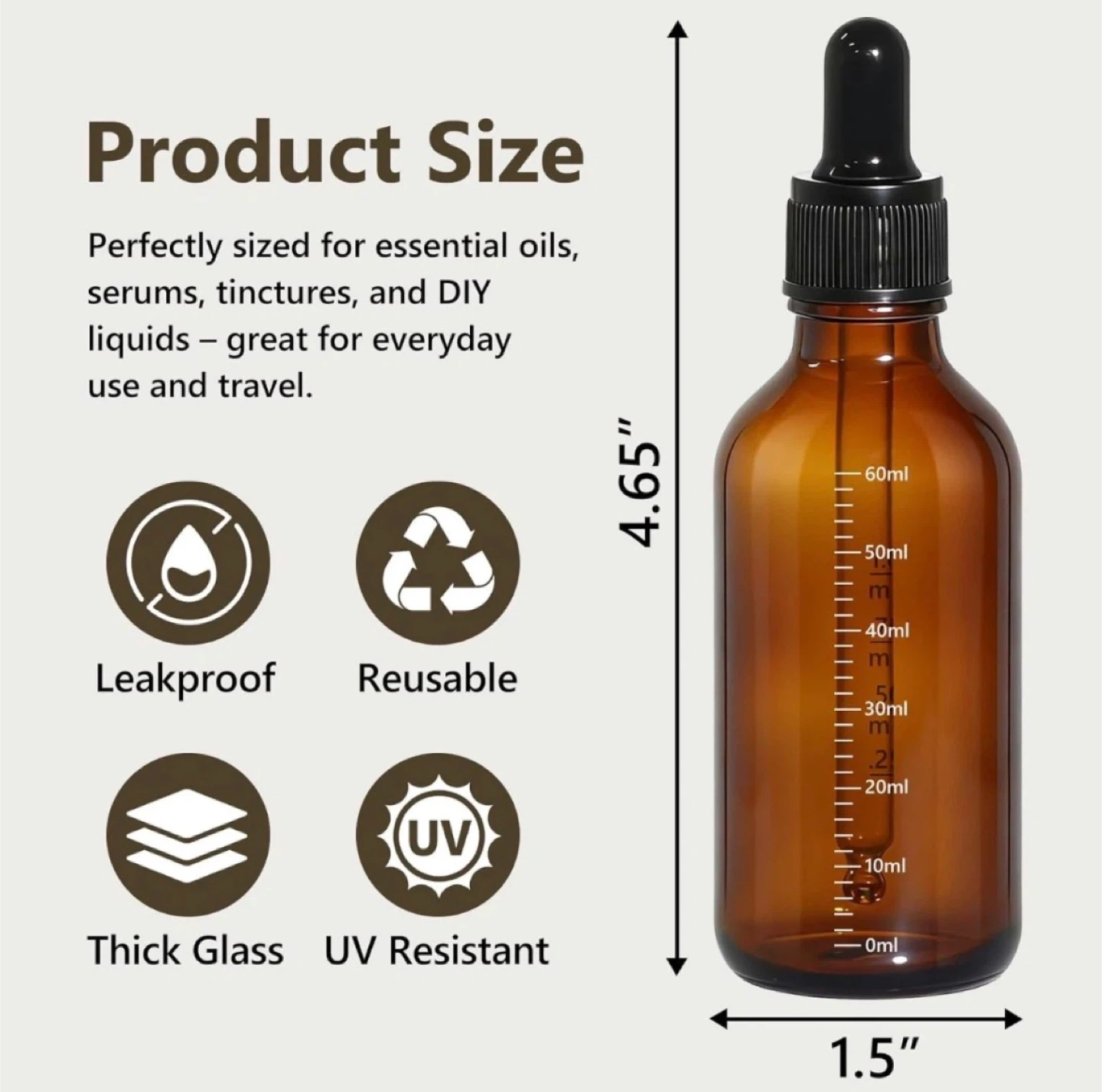 Selling a 30-pack of 2oz (60ml) brand new dark amber glass dropper bottles, ideal for storing and dispensing oils and liquid products.