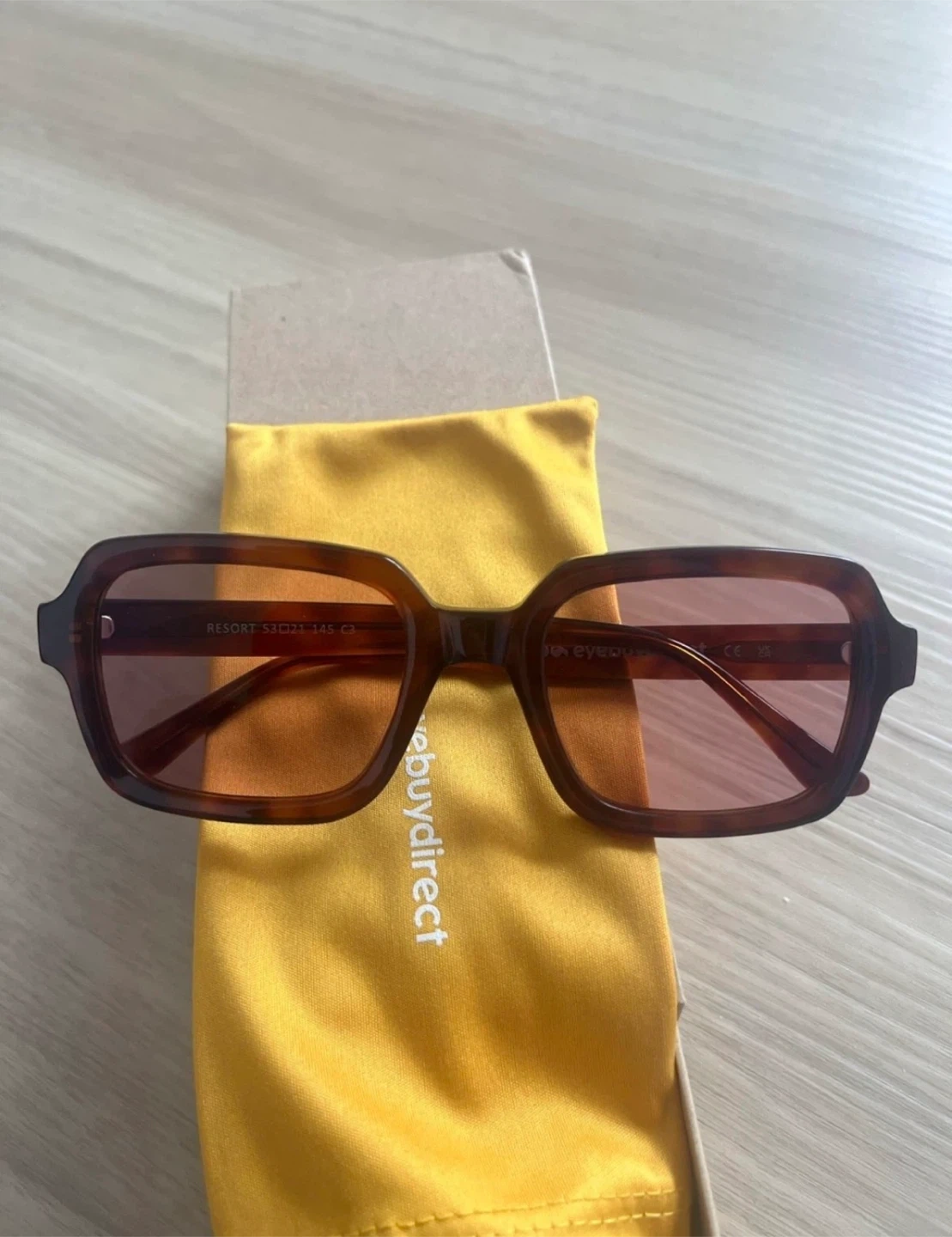 These are Eyebuydirect Resort Square Sunglasses in Tortoise. They are size Large (53 x 21-145). Includes a yellow microfiber pouch. This item is out of stock on the website.