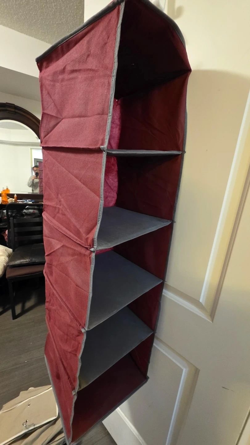 Keep your closet tidy with this handy hanging organizer! It's a burgundy colour and perfect for storing clothes, shoes, or accessories. It's in great condition and ready to help you maximize your closet space