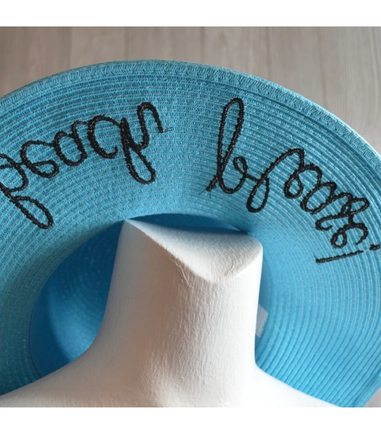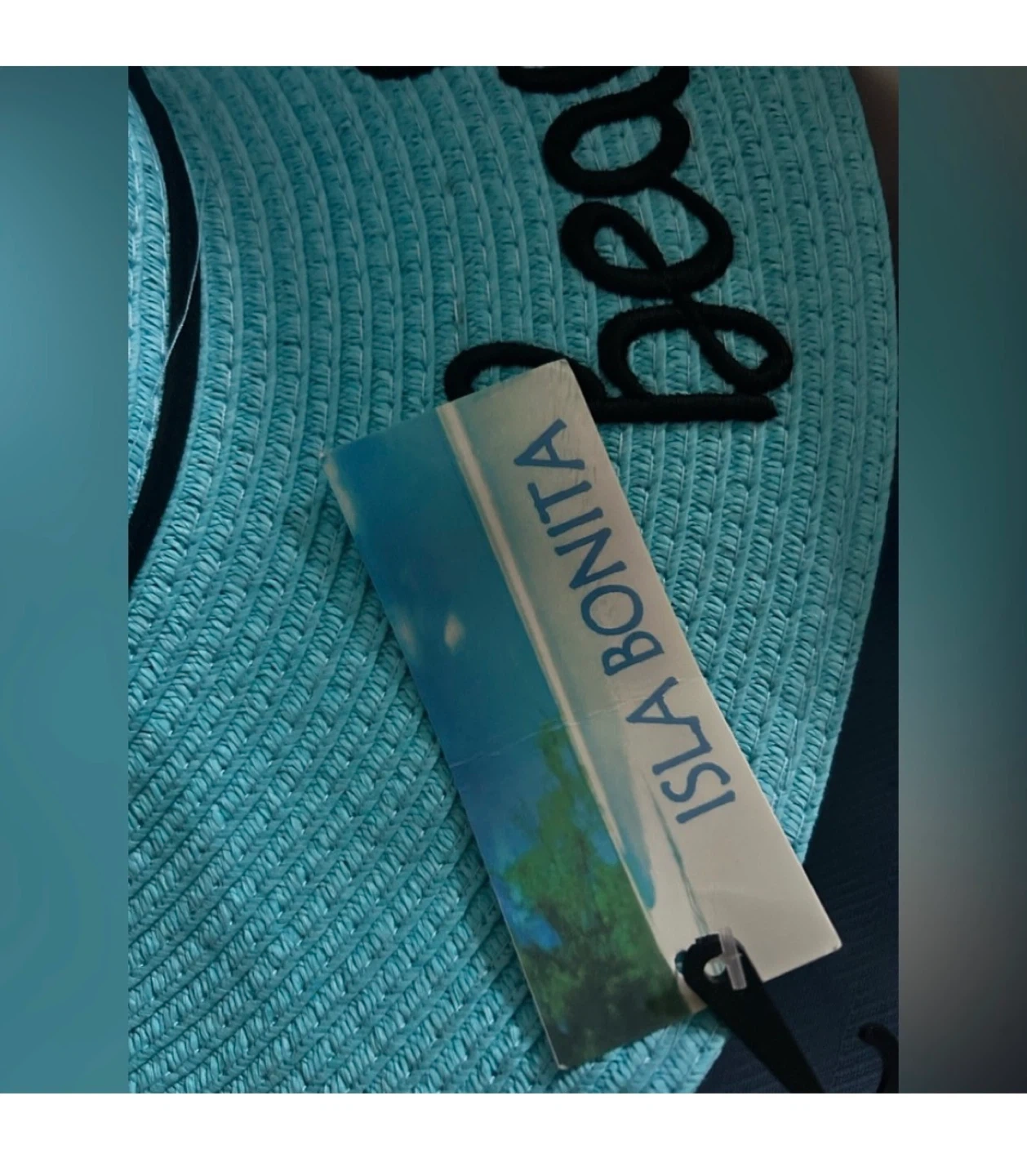 New with tag Isla Bonita wide brim sun hat in beautiful aqua/turquoise color with black trim and “Beach Please” embroidered script.