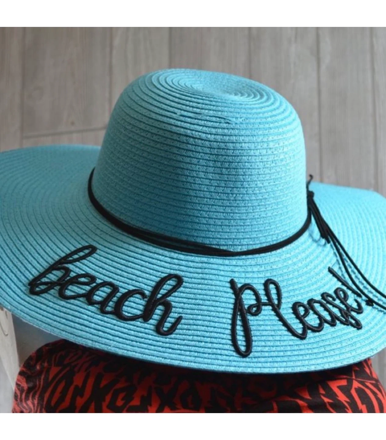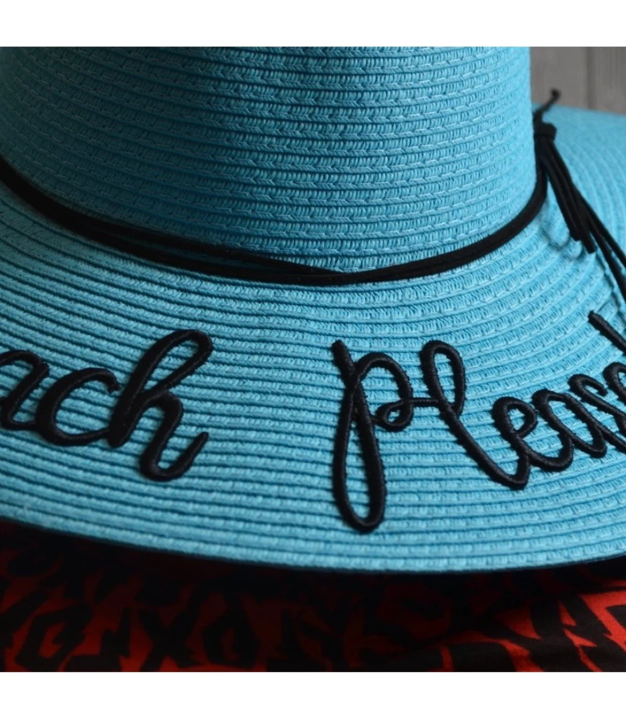 New with tag Isla Bonita wide brim sun hat in beautiful aqua/turquoise color with black trim and “Beach Please” embroidered script.