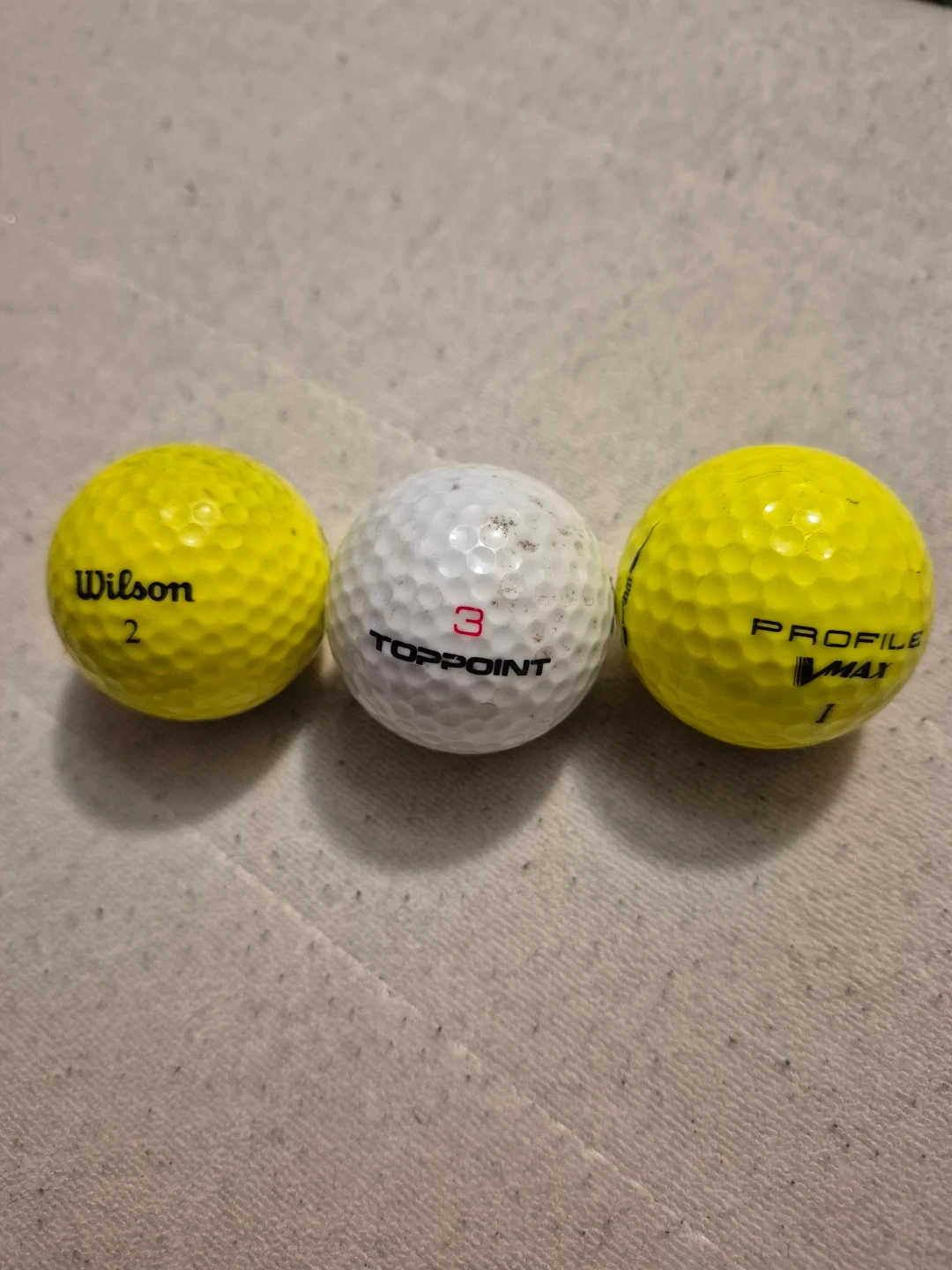 Three golf balls included: one yellow Wilson, one white Top Flite, and one yellow Profile Max. These balls are suitable for practice or casual rounds of golf. They're a great way to build up your golf ball collection.
