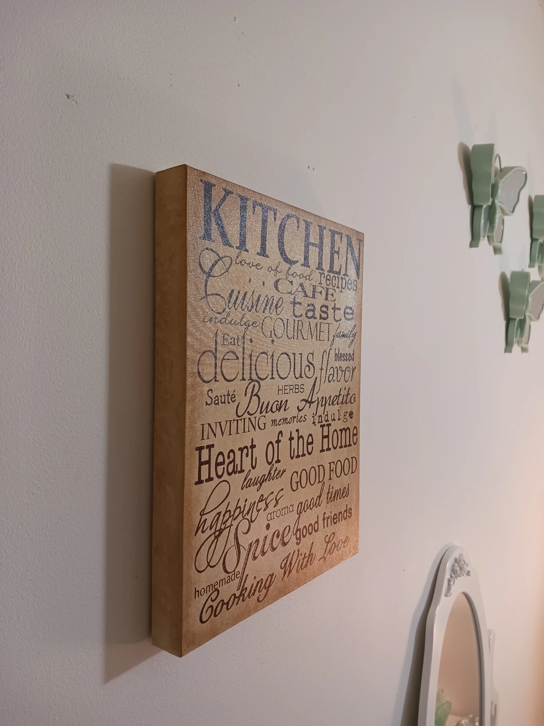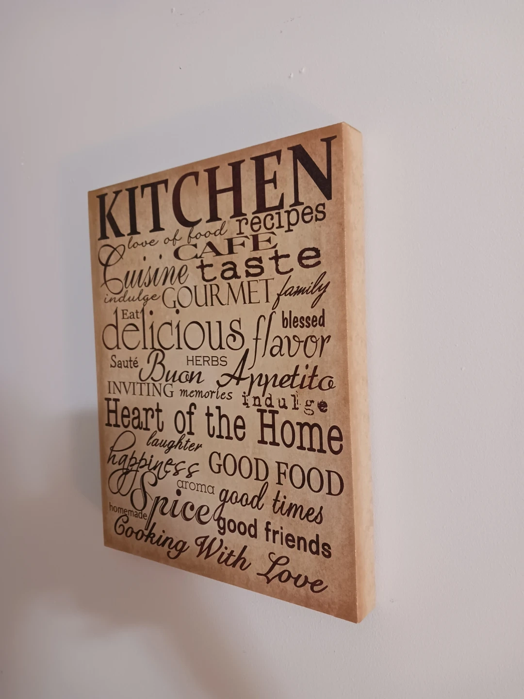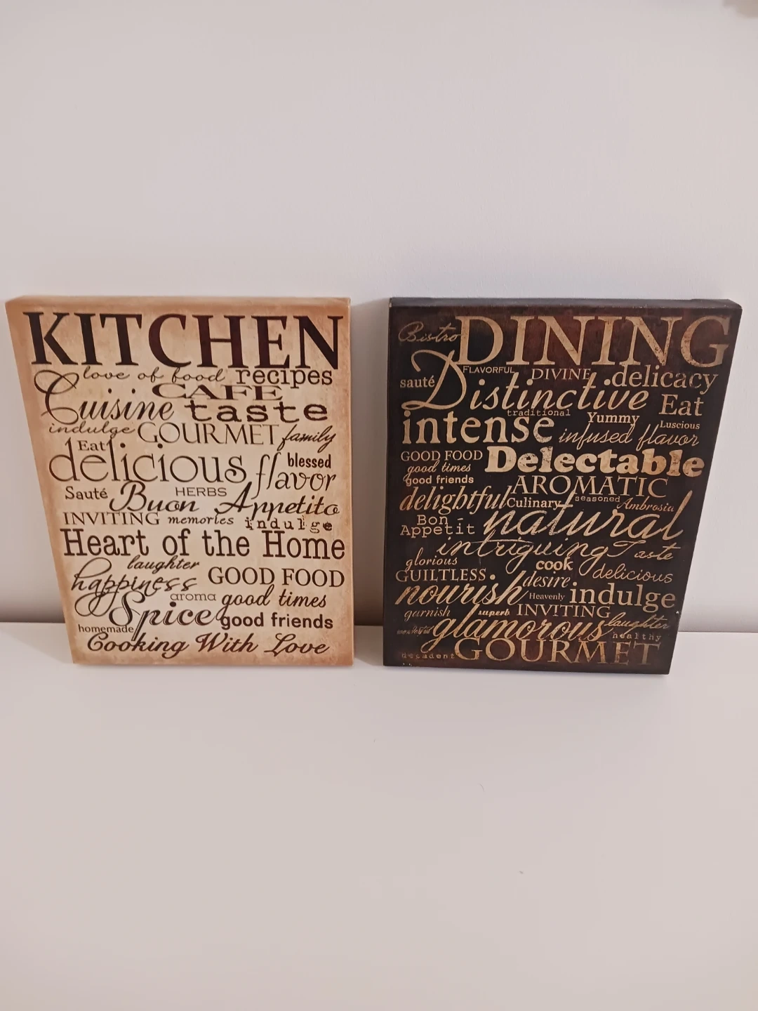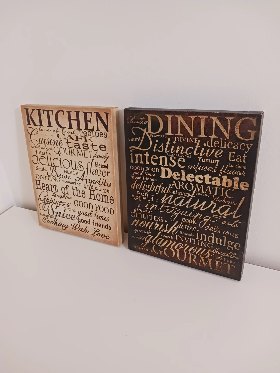 One plaque features a light wood tone with “Kitchen” wording, and the other has a darker wood tone with “Dining” wording.